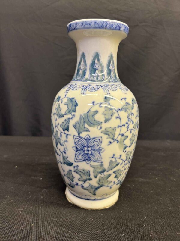Chinese porcelain vase featuring blue and green floral patterns. 10.25″ high.