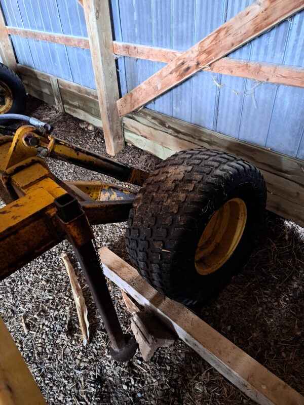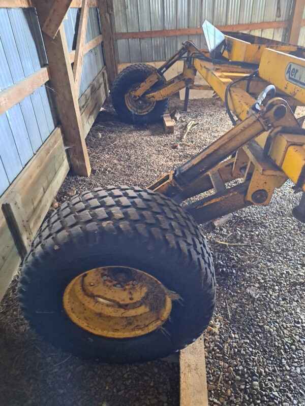 Trailer-model aerator with hydraulic lift, weight boxes, wide tires, and never spikes.