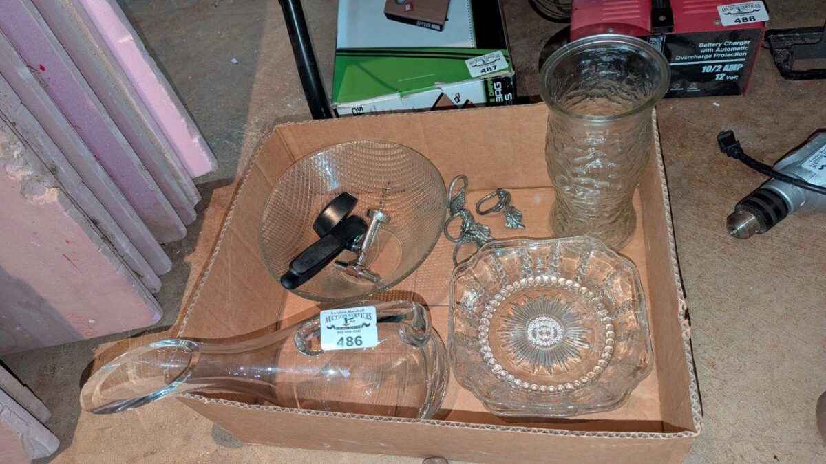 Carafe, vase, glass bowls, napkin rings