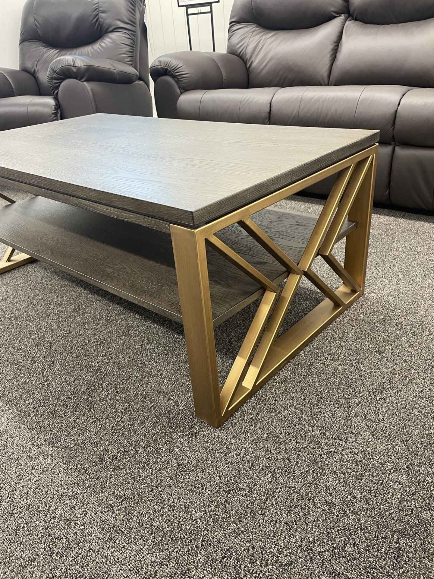 A modern contemporary mixed media collection with framed metal ends in Brass Finish and two panel appearance Ash Veneer tops in Cocoa Finish. Angular stylized "X" metal ends complement the horizontal feel of the tops and shelves.