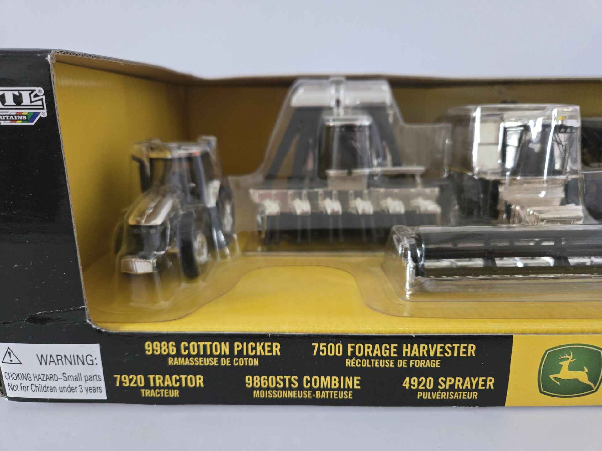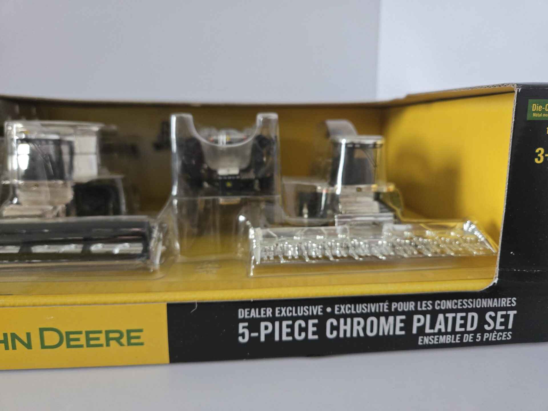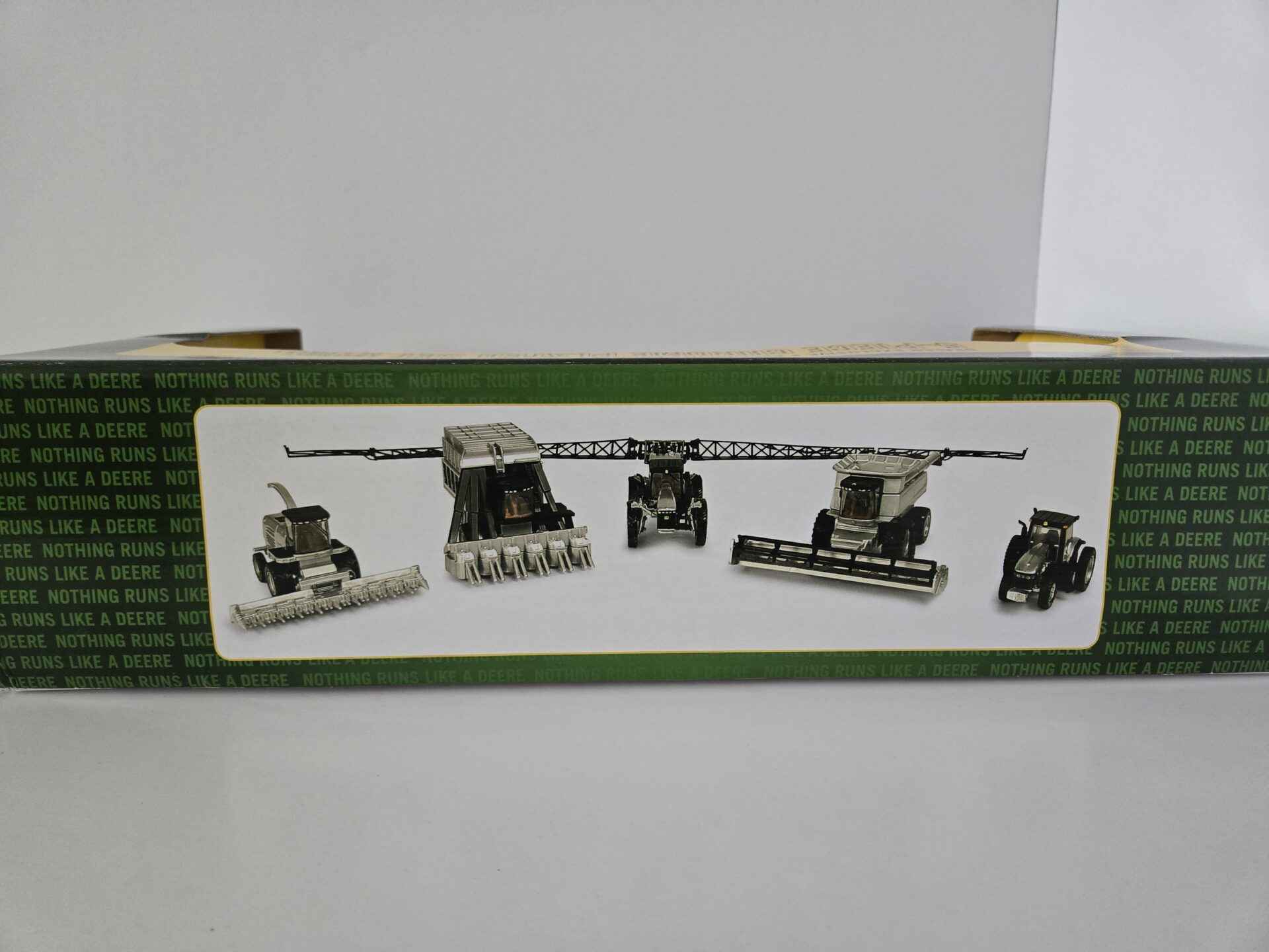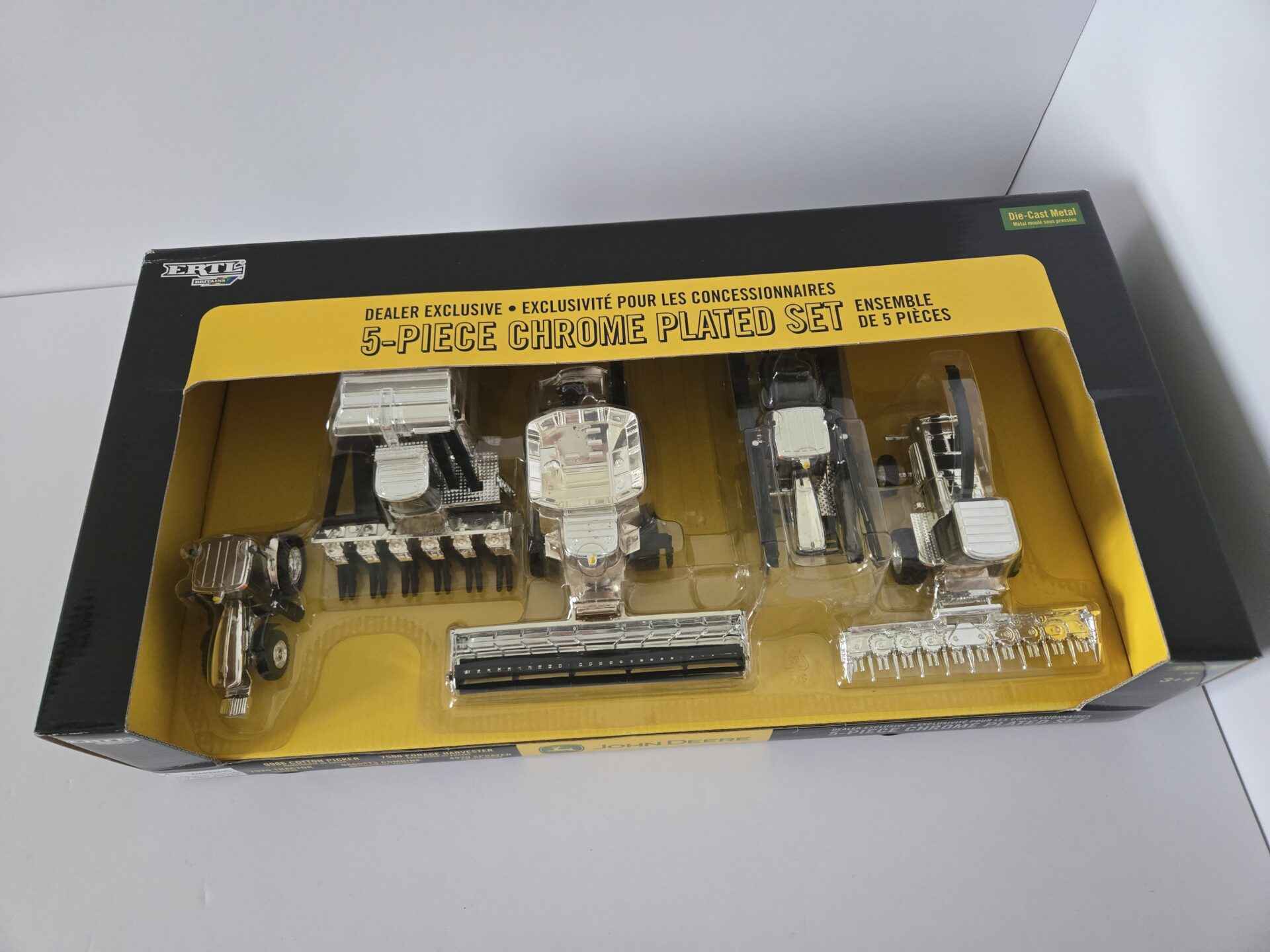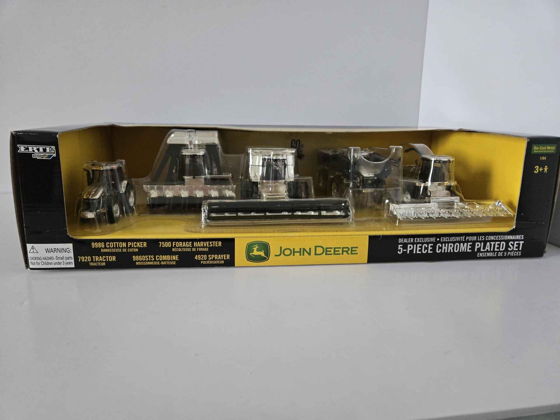 1/64 – John Deere 5-Piece Chrome Plated Set – 9986 Cotton Picker / 7500 Forage Harvester / 7920 Tractor / 9860STS Combine / 4920 Sprayer – Dealer Exclusive – New In Box