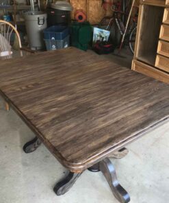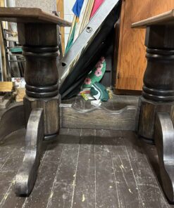 Solid Wood double pedestal table with 3 leaf inserts. Has been completely refinished. 61″ long x 42.5″ wide. Each leaf 11.75″ wide.