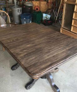 Solid Wood double pedestal table with 3 leaf inserts. Has been completely refinished. 61″ long x 42.5″ wide. Each leaf 11.75″ wide.