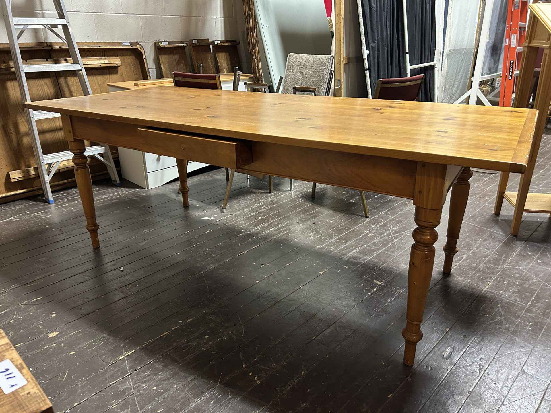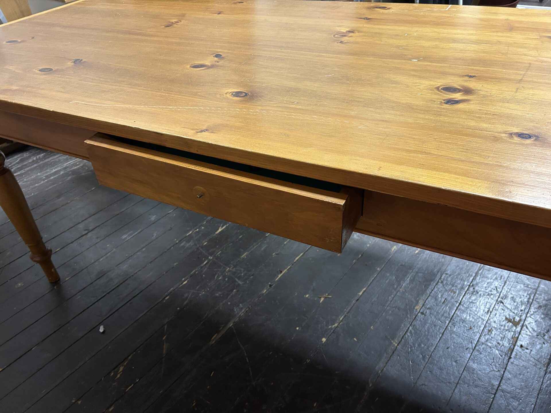 Wooden harvest table with drawer, pine, 85″ long x 36.25″ wide x 31.5″ high. Lovely condition.
