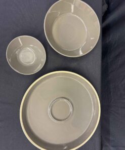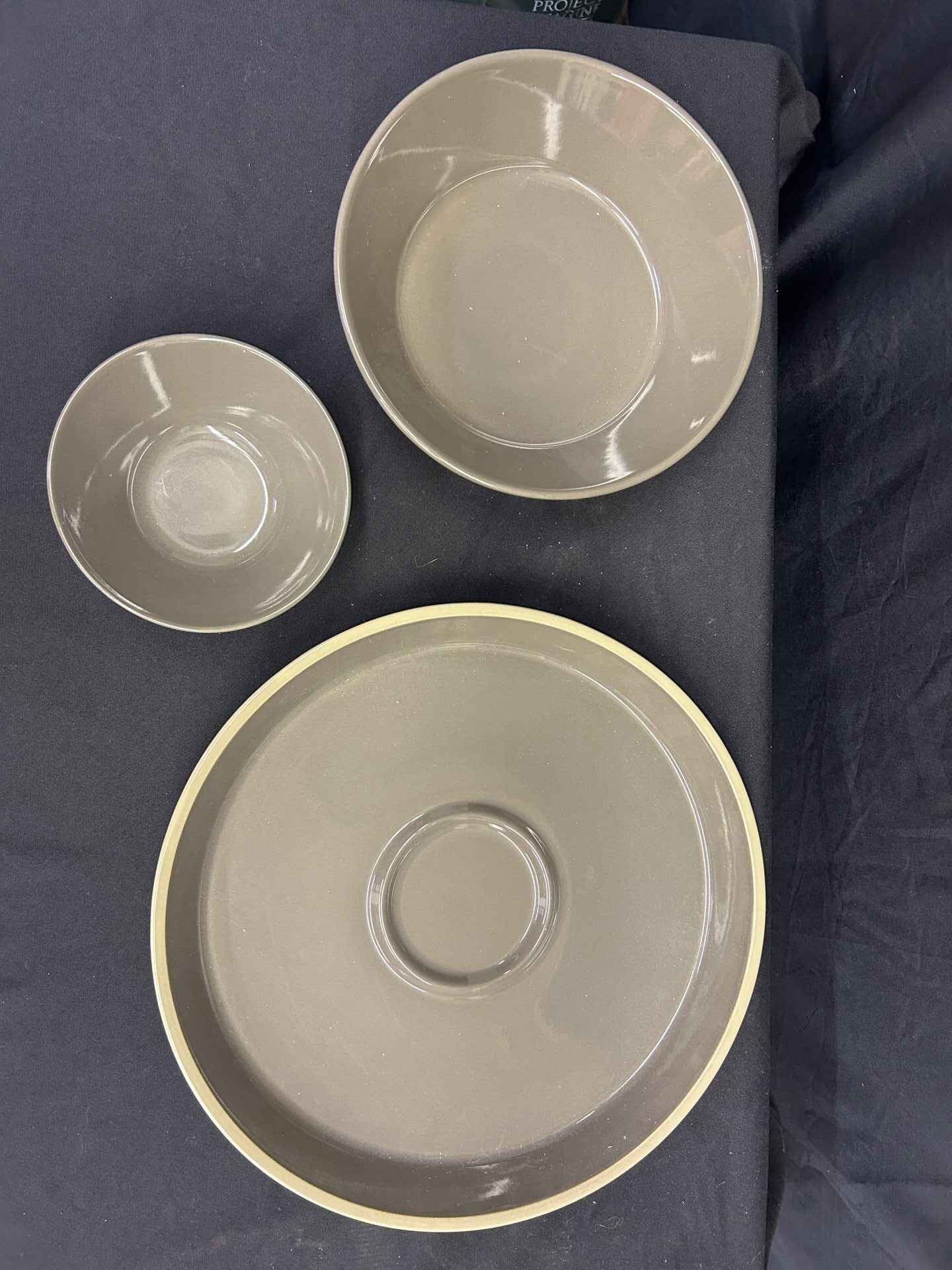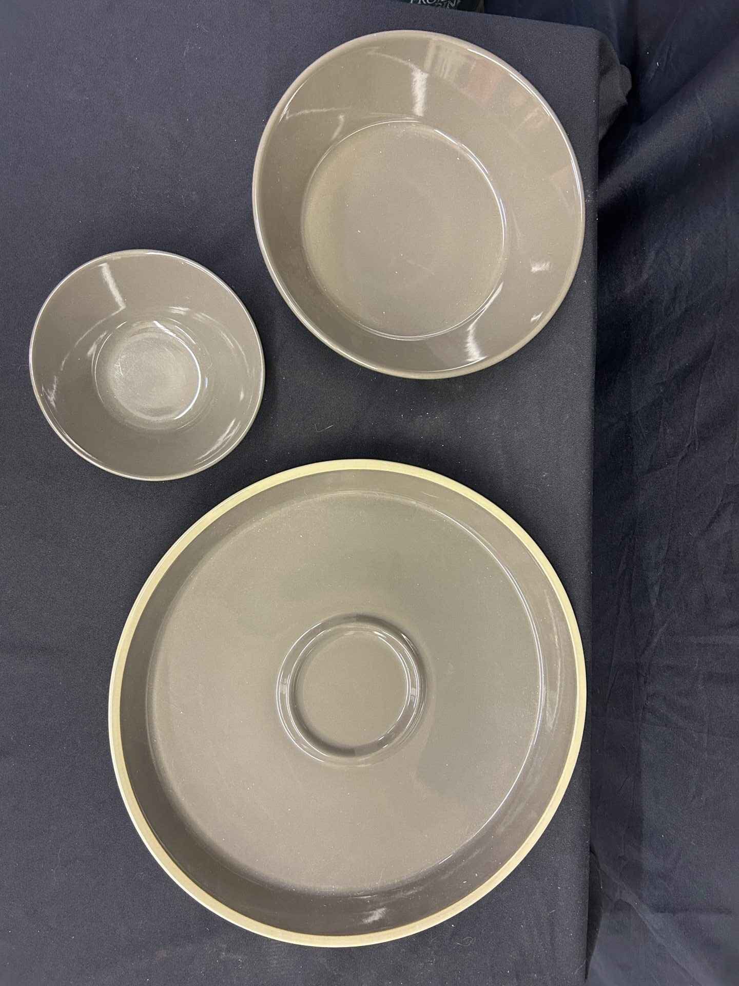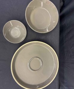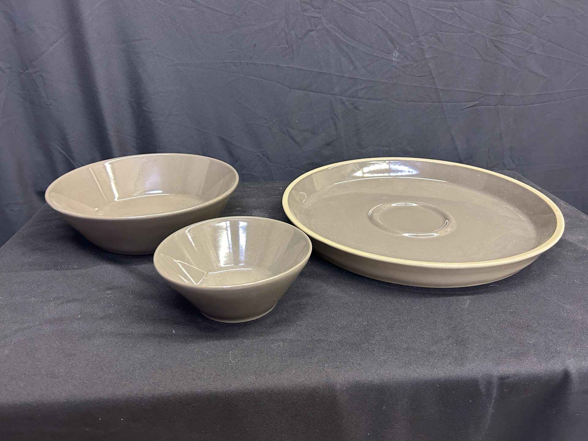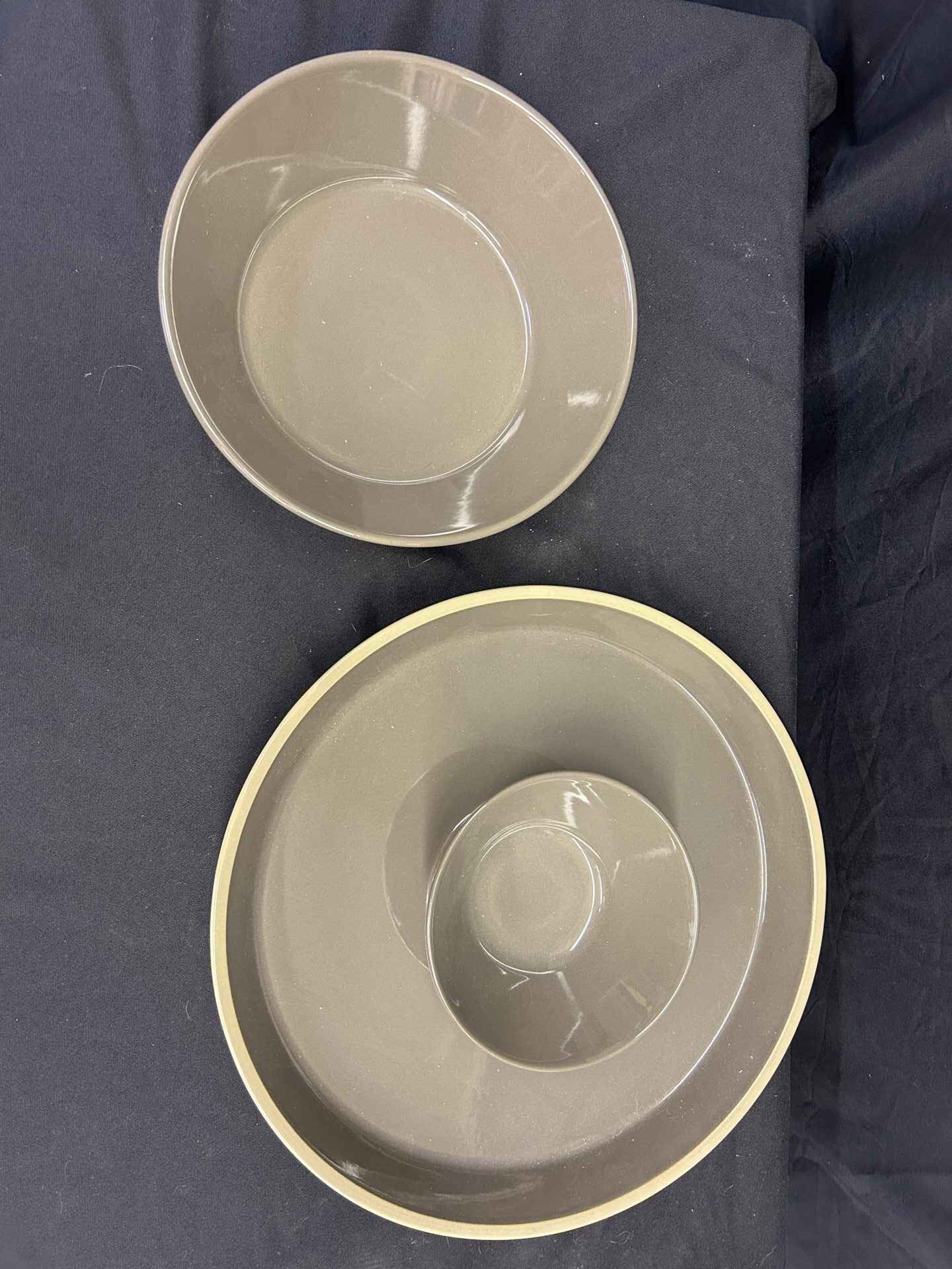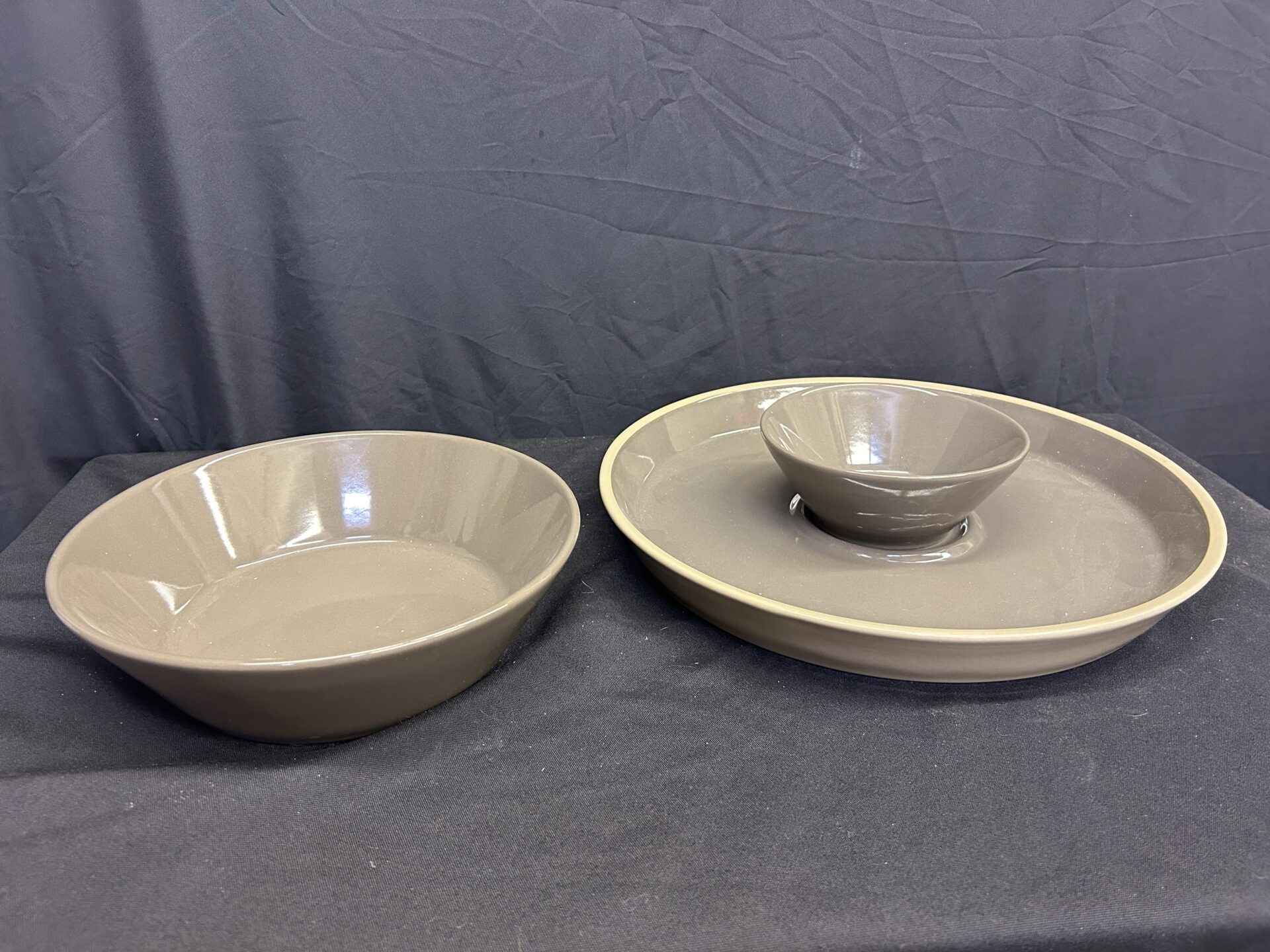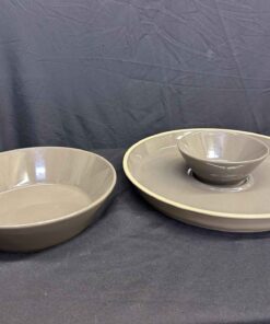 Pampered Chef stoneware, lovely gray/taupe colour, veggie tray (15″dia.) and dip bowl (6.5″ dia., and larger bowl. 10″ dia.