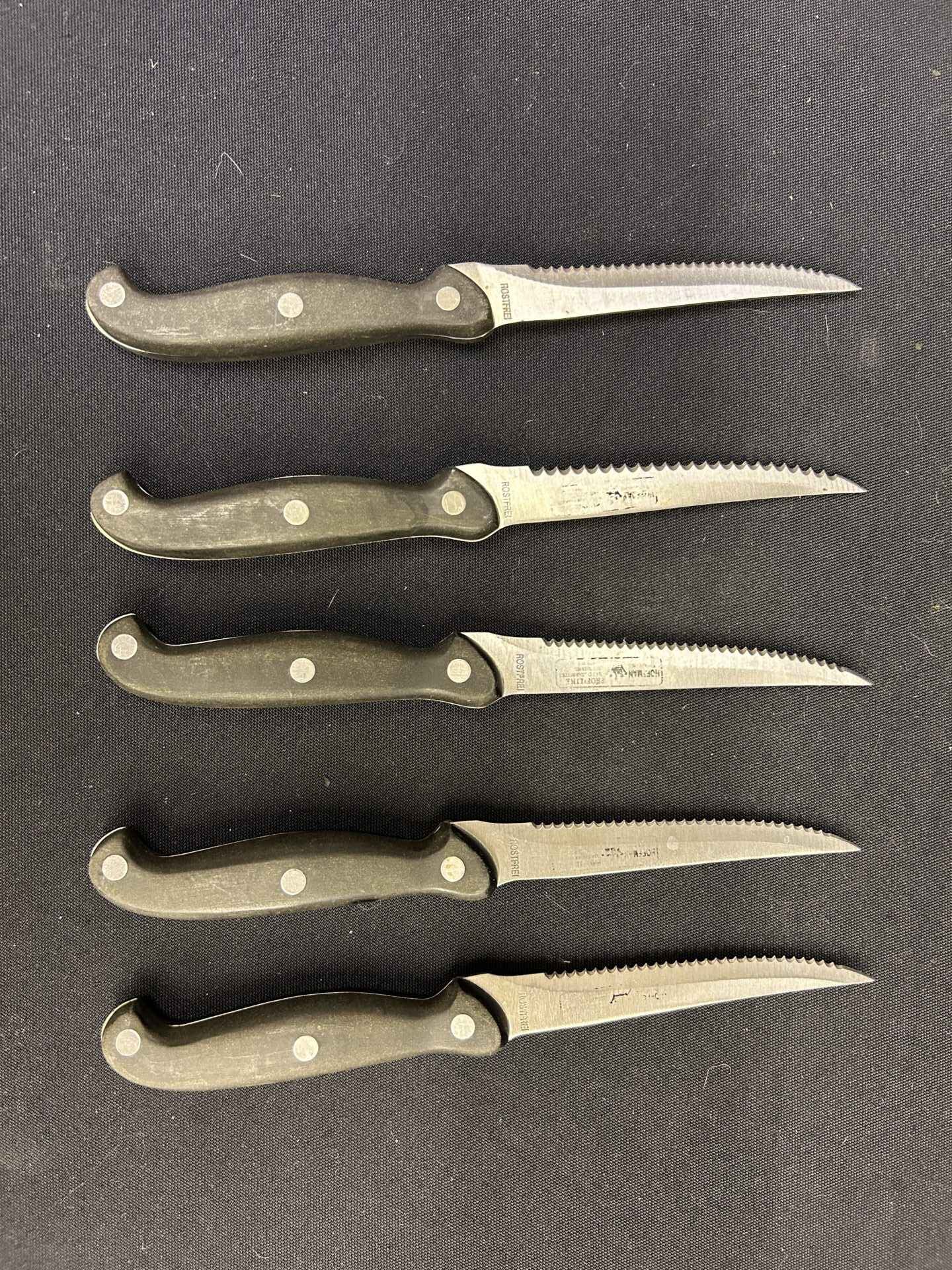 5 steak knives. Rostfrei brand. Very sharp and good quality.