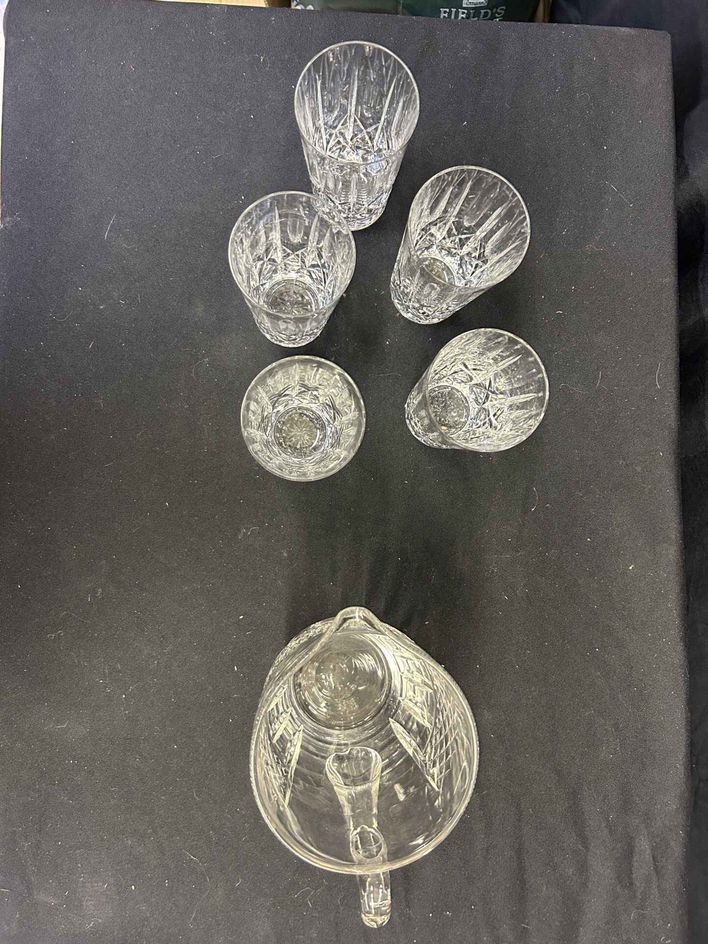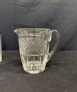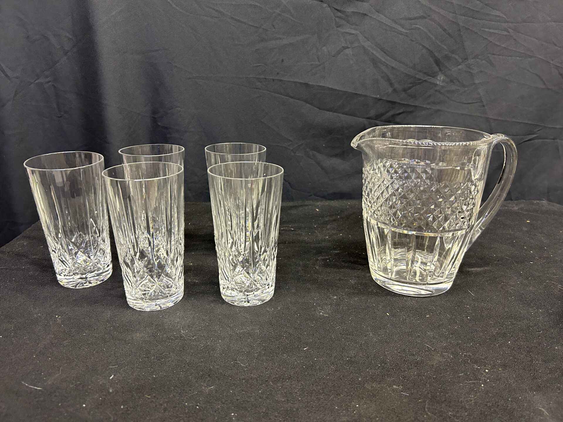 5 crystal highball glasses and a beautiful cut glass pitcher. Pitcher is 6.5″ high.
