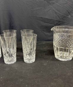 5 crystal highball glasses and a beautiful cut glass pitcher. Pitcher is 6.5″ high.