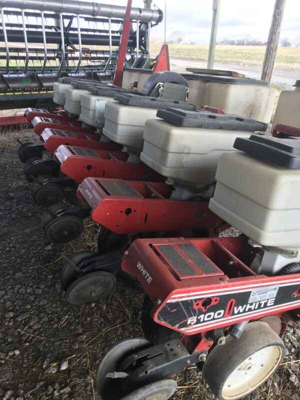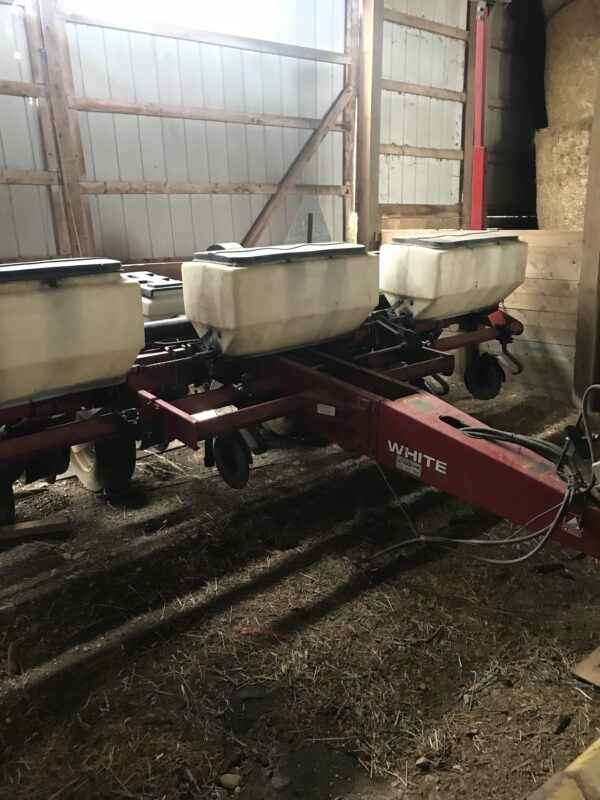 A 1995 White 6100 6-row planter; stored inside with monitor and service booklet included.