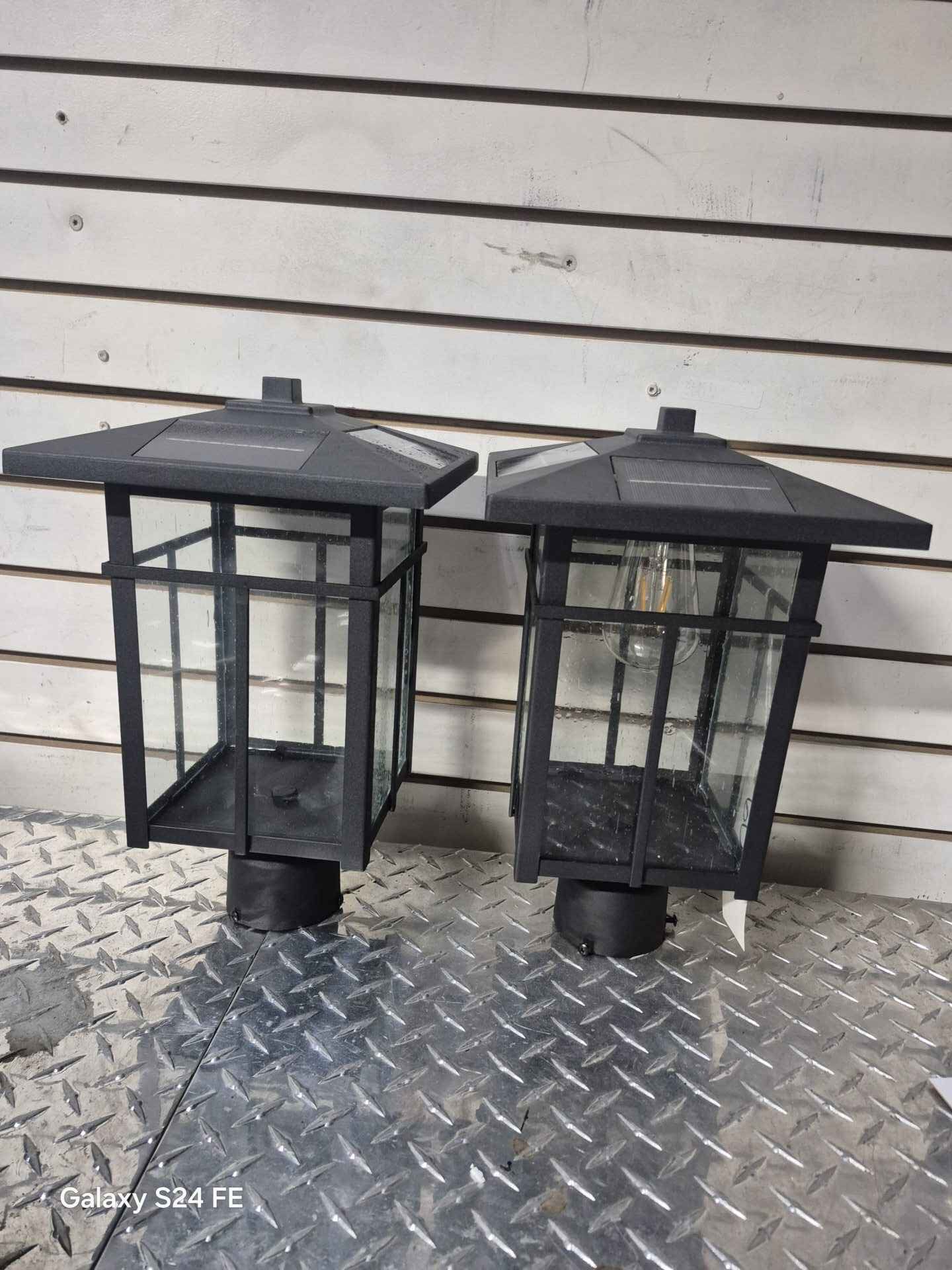 2 large die-cast solar lights fit up to 3″ round posts….1 bulb missing