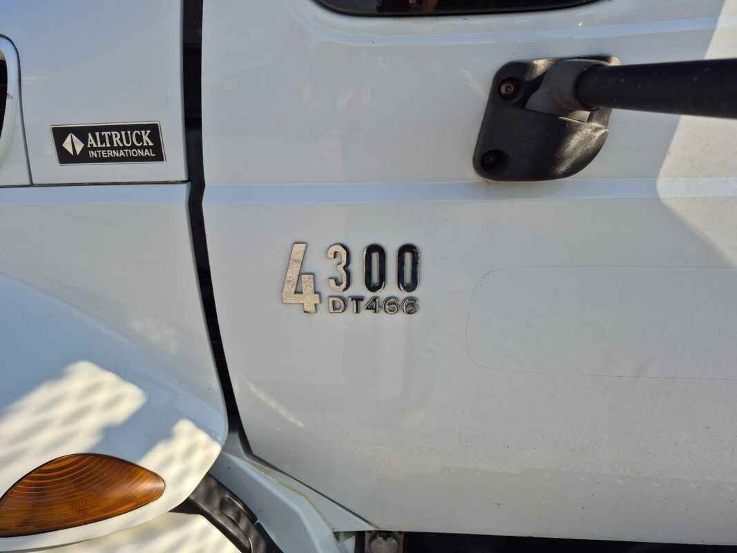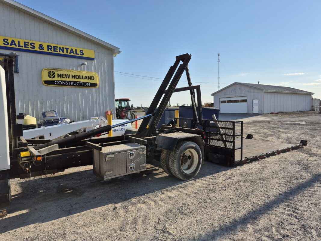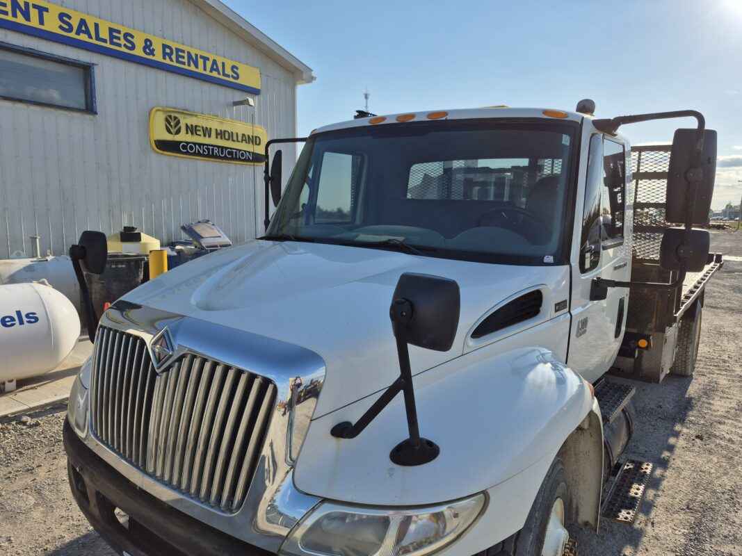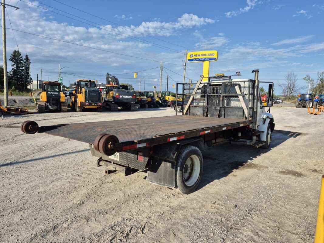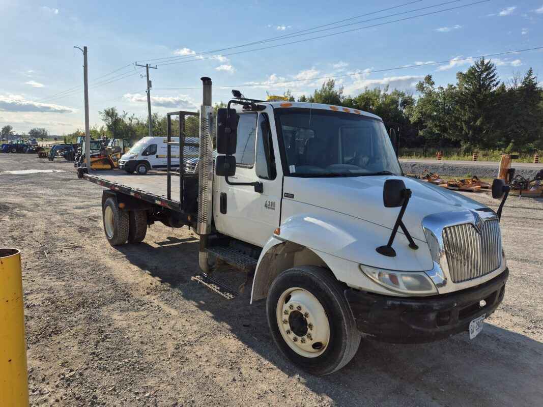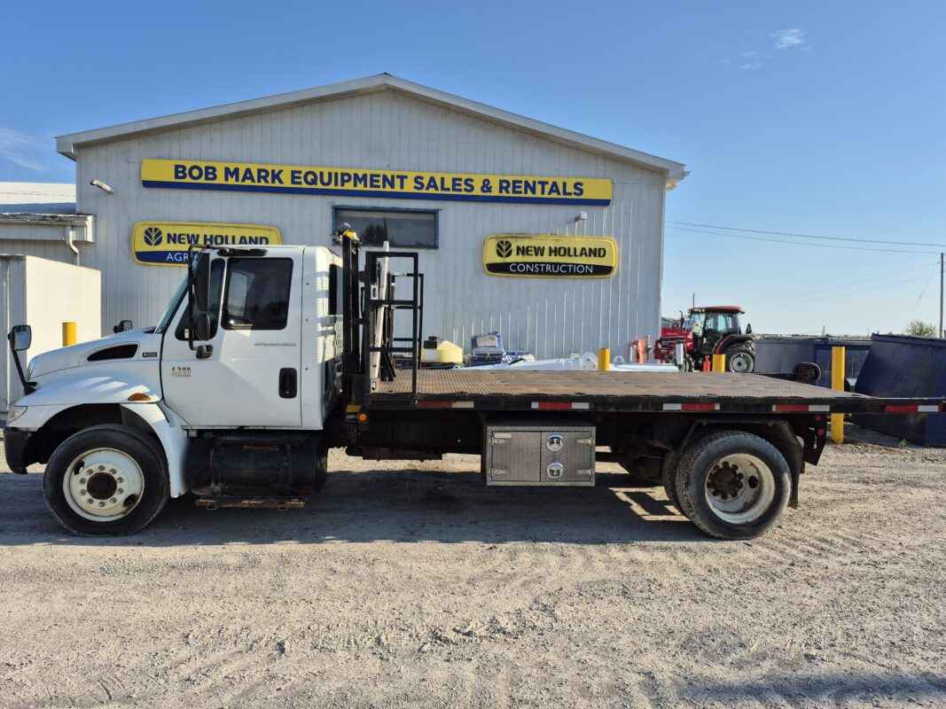 2004 International 4300 with Kargo King hooklift system, Pre-Emission International DT466 engine, 16 foot flatbed deck, Chain/Storage Box, Front fender mirrors, International 6 Plus standard transmission, Good strong running truck & Hooklift system, 360437 kilometres, Bob Mark Equipment Sales & Rentals, 2197 Little Britain Rd. Lindsay K9V 4S5, Darryl 705-879-0138