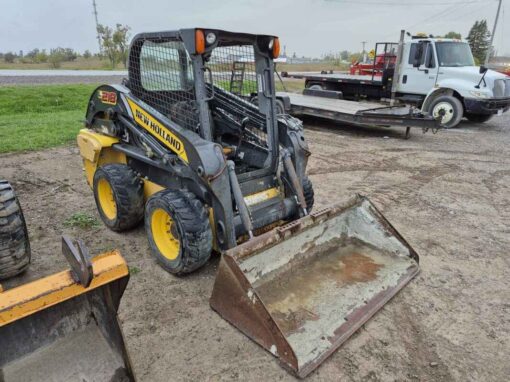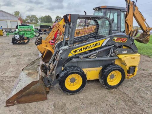 2013 New Holland L218 skidsteer, Mechanical hand & foot controls, Single speed transmission, 10-16.5 tires, Auxiliary boom hydraulics, Manual bucket coupler, 66 inch material bucket with bolt-on cutting edge, 2975 hours, Engine turns over & currently not running, Bob Mark Equipment Sales & Rentals, 2197 Little Britain Rd. Lindsay, 705-879-0138 Darryl