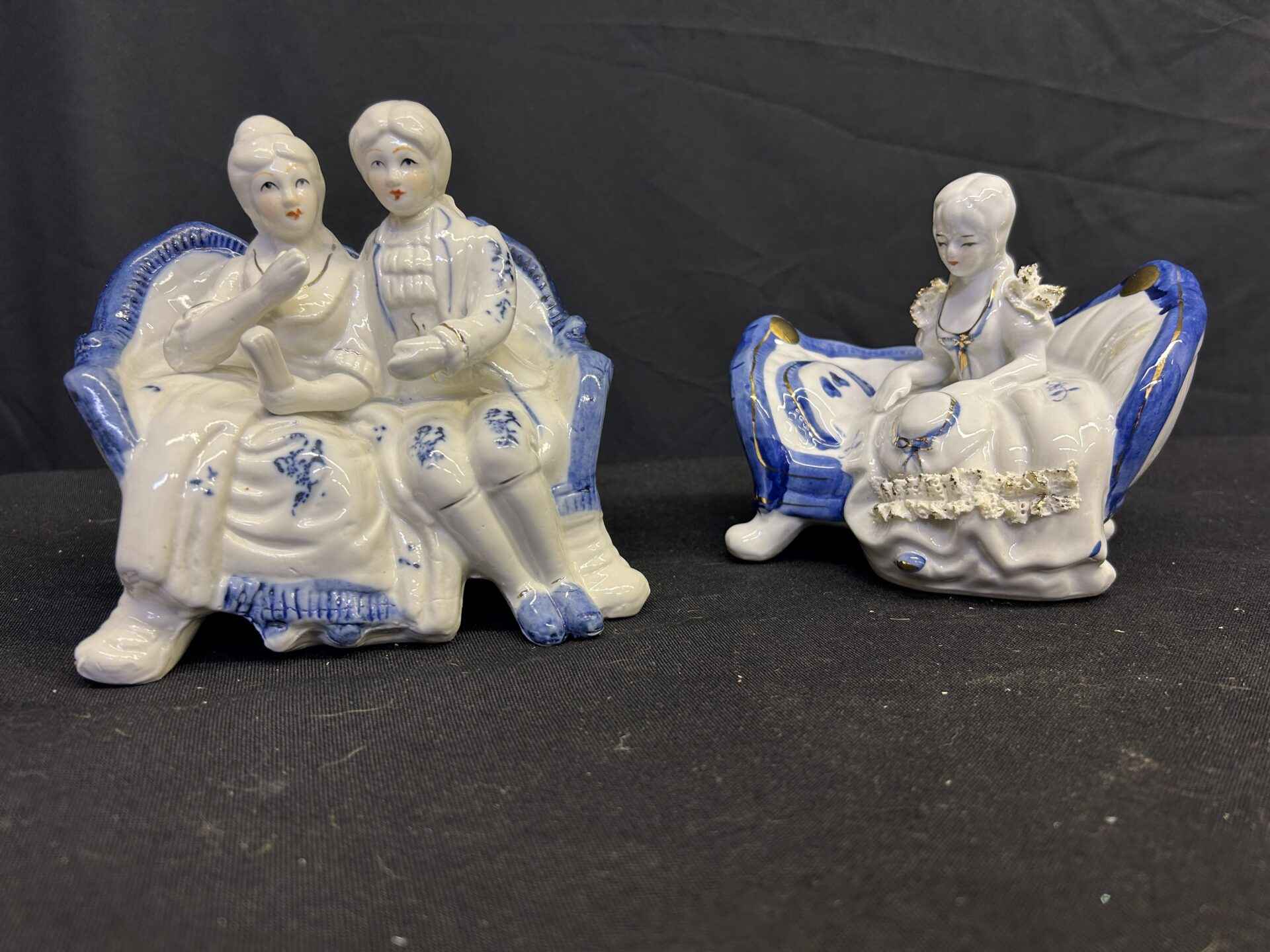 Vintage porcelain figures. Couple measures 6×6. Single girl measures 5×5.