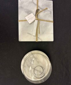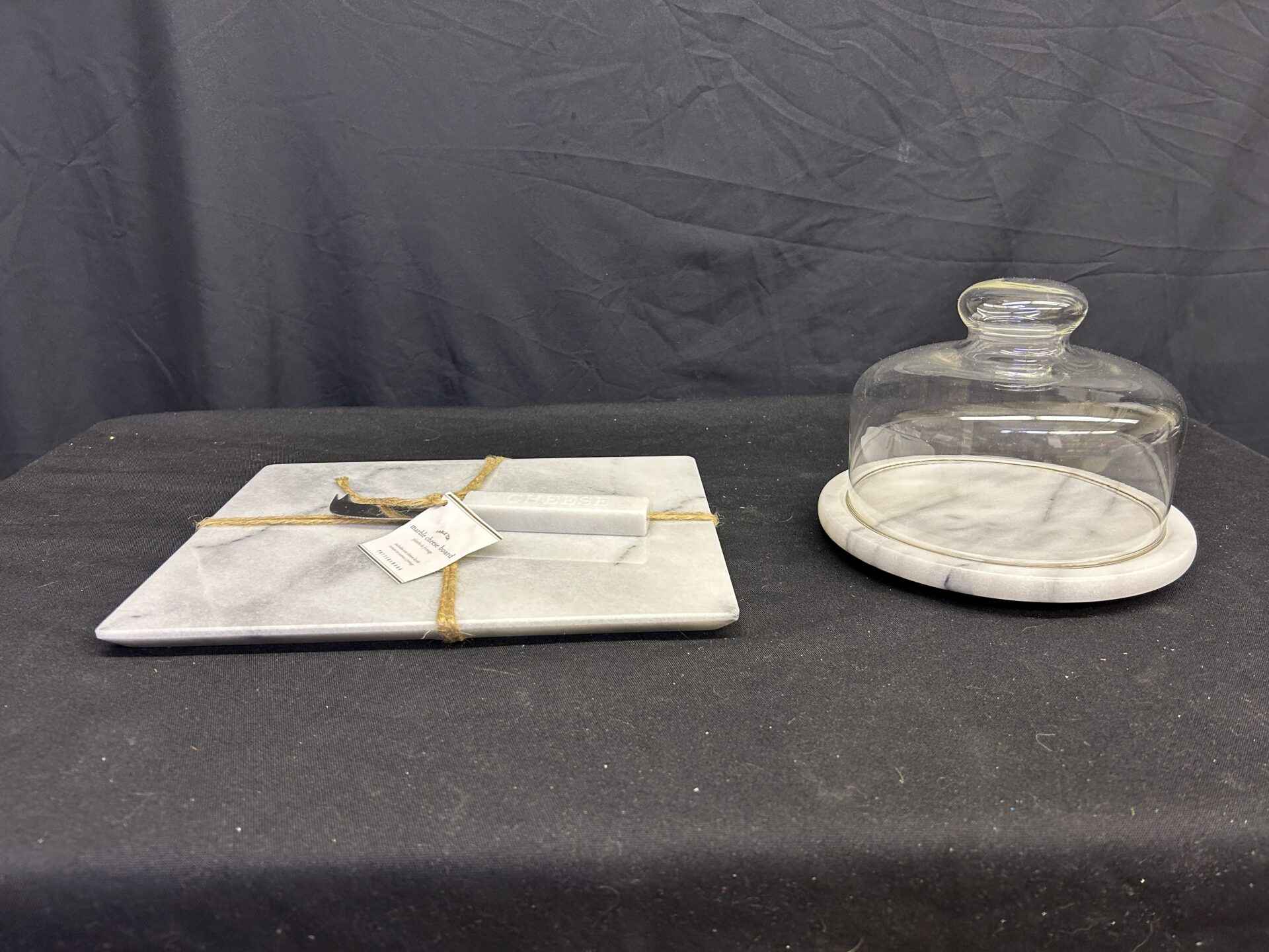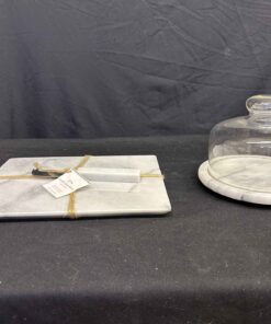 Marble Cheese set. Marble cheese board including cheese knife 11×9″. Covered Cheese plate with a glass dome 7.5″ dia. X 5.5″ high.