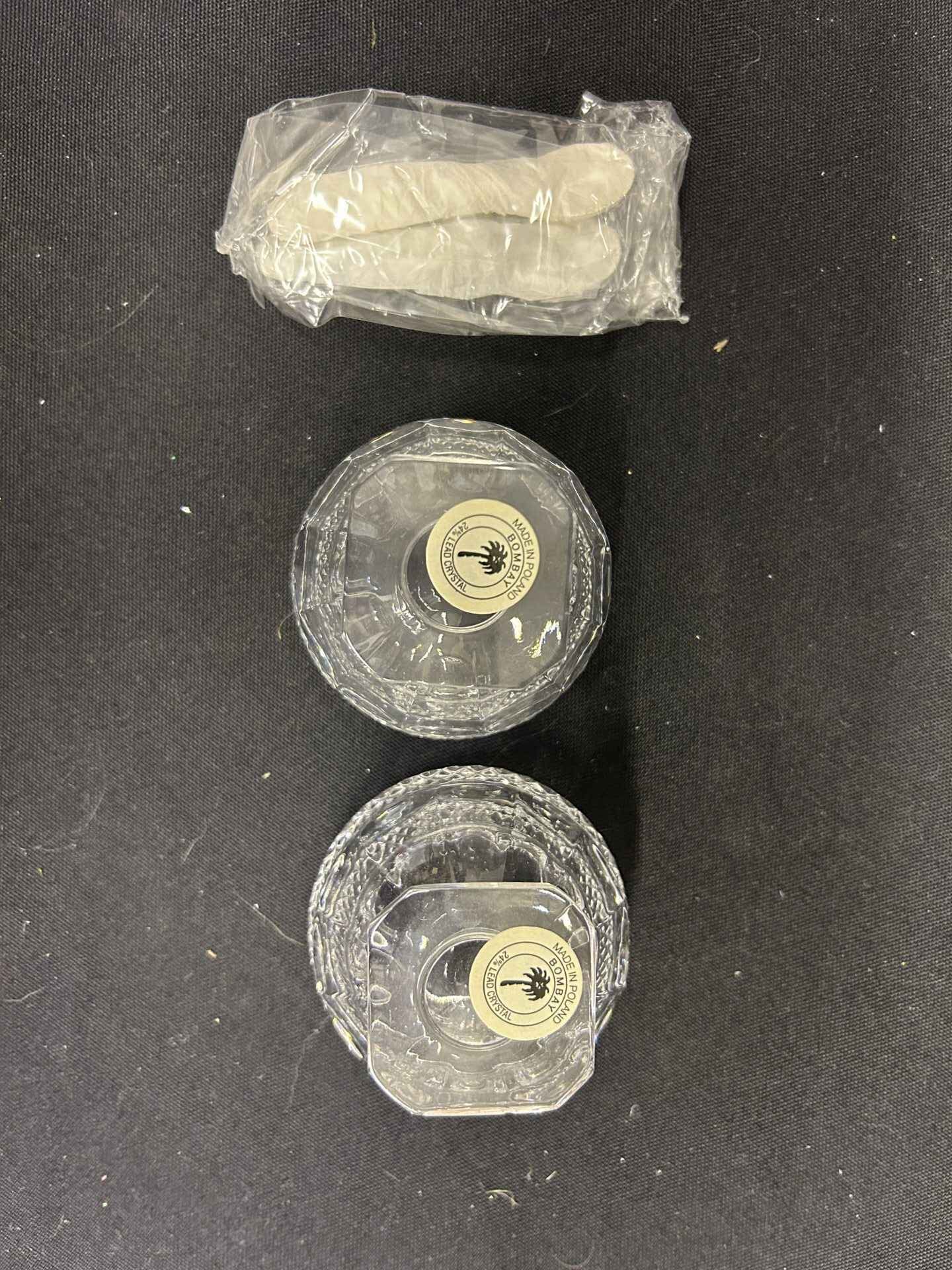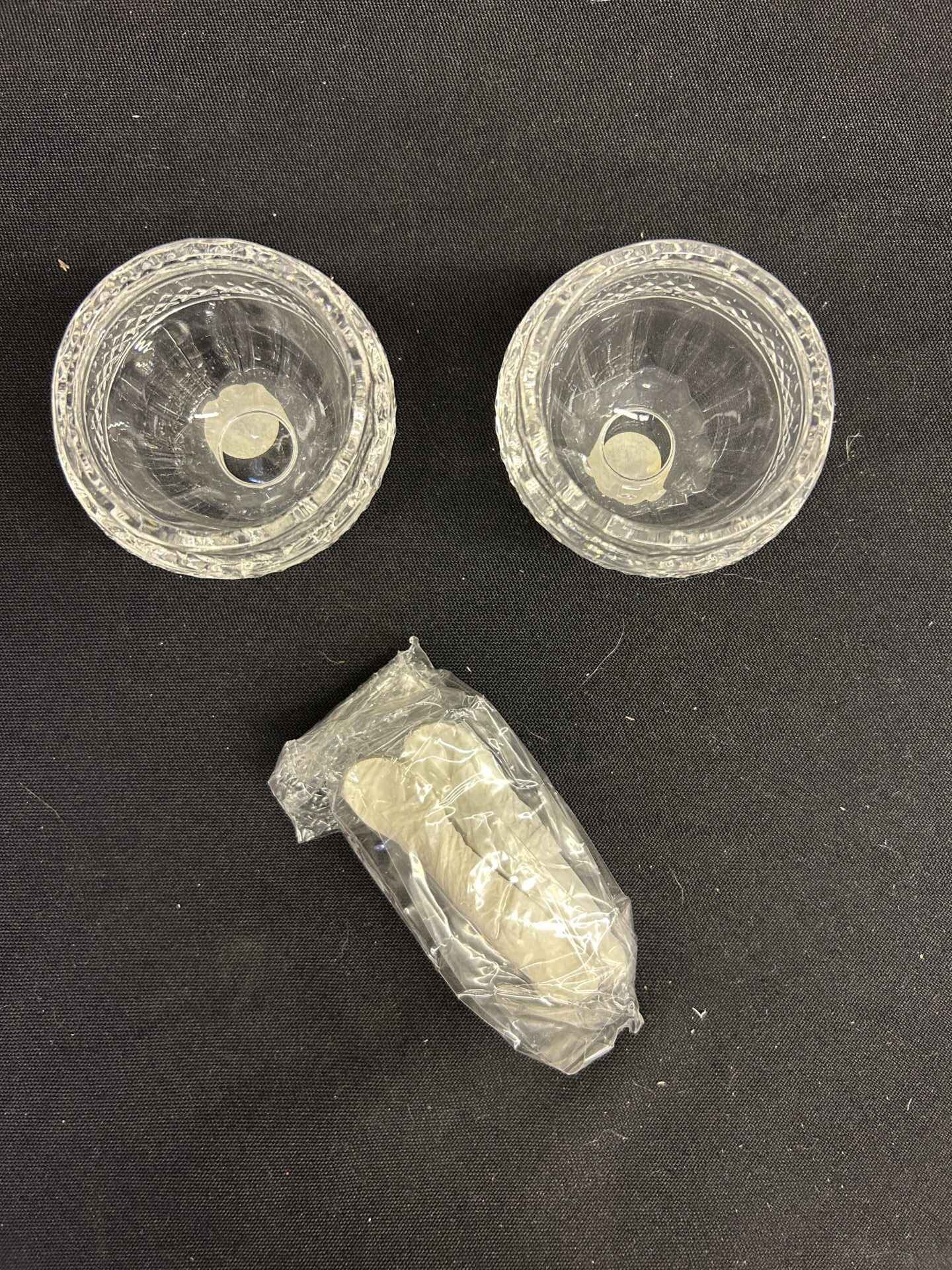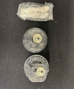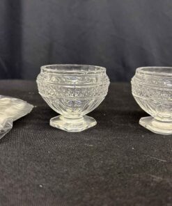 Crystal relish dishes with 2 little spoons. 2.5″ dia. X 2.25″ high.