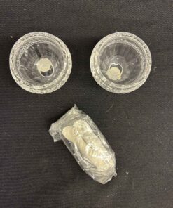 Crystal relish dishes with 2 little spoons. 2.5″ dia. X 2.25″ high.