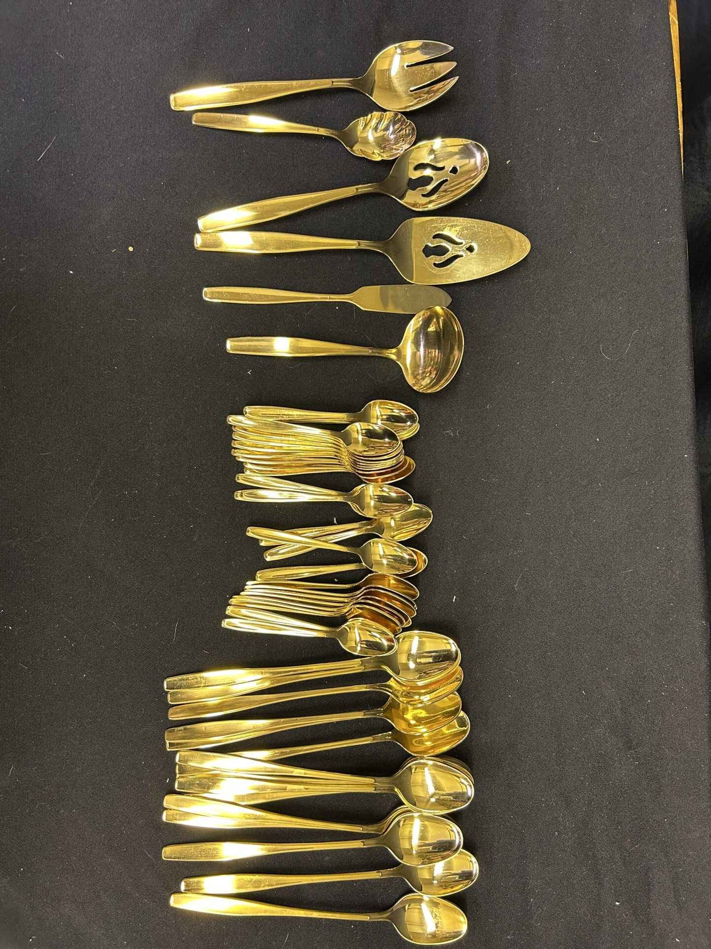 Rogers Cutlery Co. Stainless spoon set including 16 parfait spoons, gravy spoon, 35 small teaspoons, cake server, cheese spoon, salad set and fluted spoon.