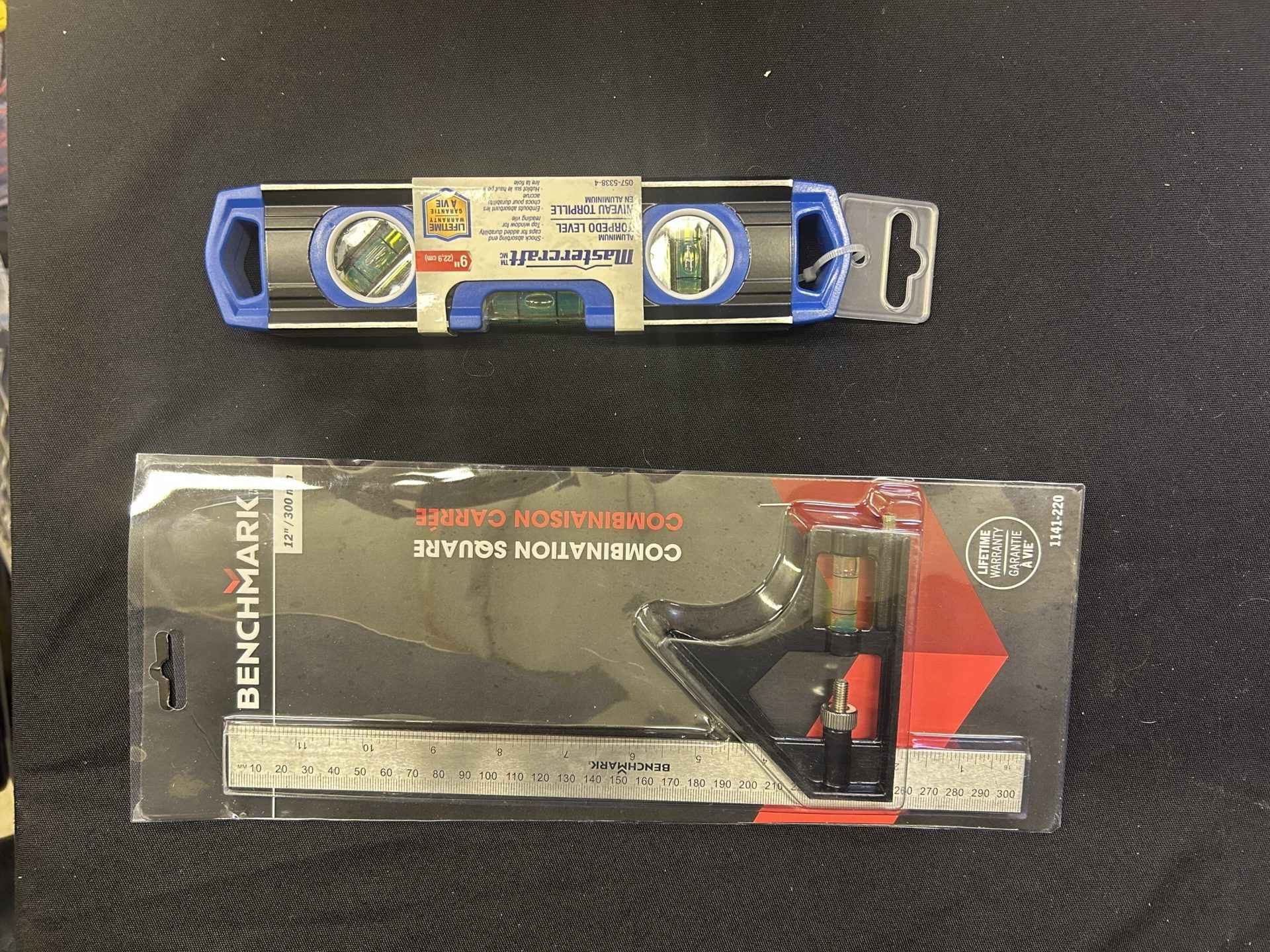 Mastercraft 12″ torpedo level, brand new. Benchmark 12″ combination square, brand new.