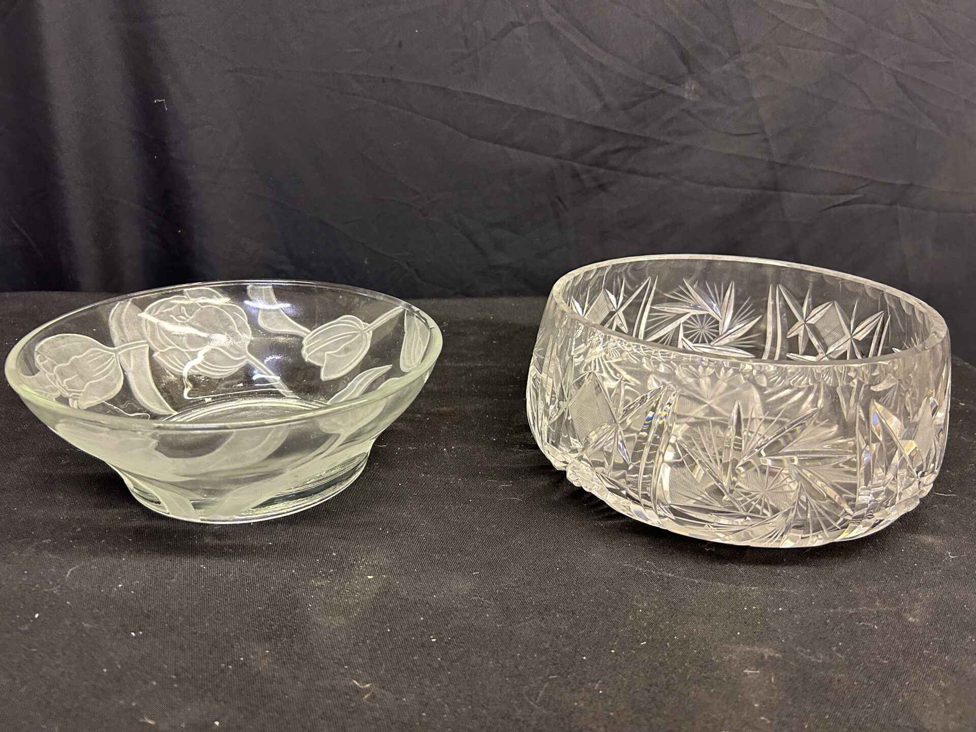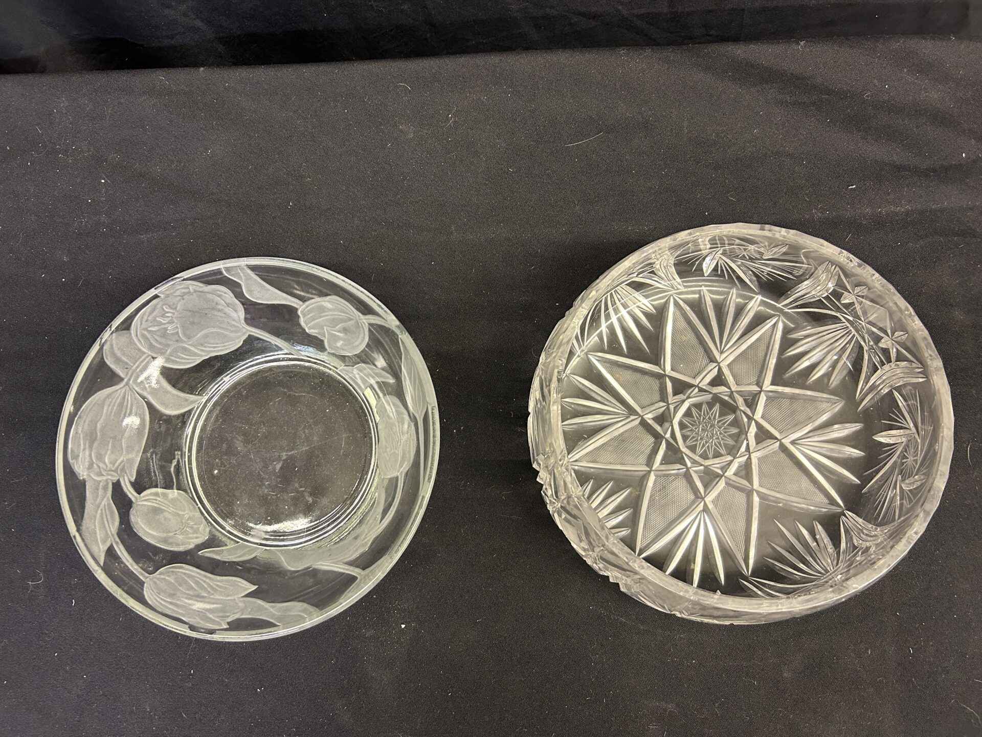 2 glass bowls. 1 cut glass pinwheel crystal. 1 embossed glass with floral pattern.