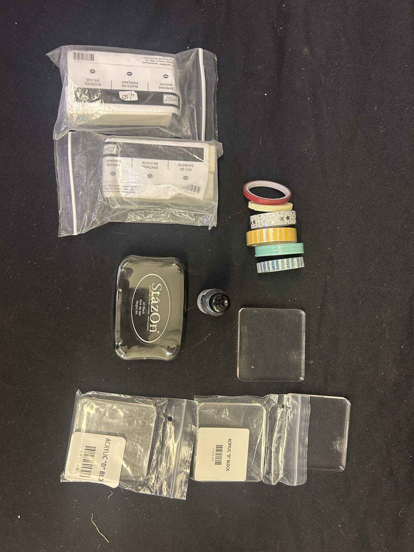 Stampin’ Up! Stamp accessories – 4 stamp blocks, black stamp pad and ink, 6 border tapes, 2 sanding blocks. All brand new.