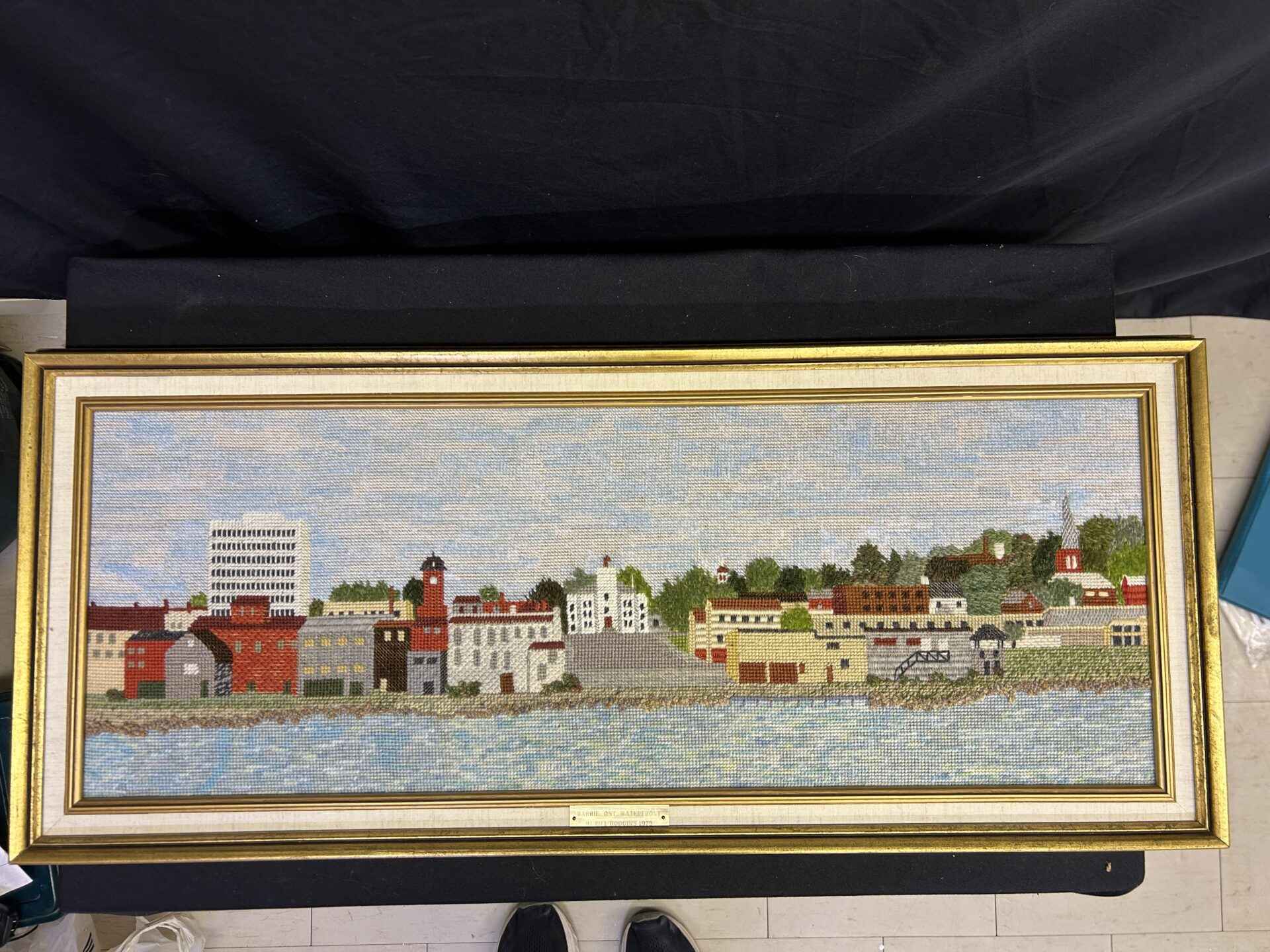 336 – Embroidered picture of the Barrie Waterfront, created by Muriel Hodgins in 1975.