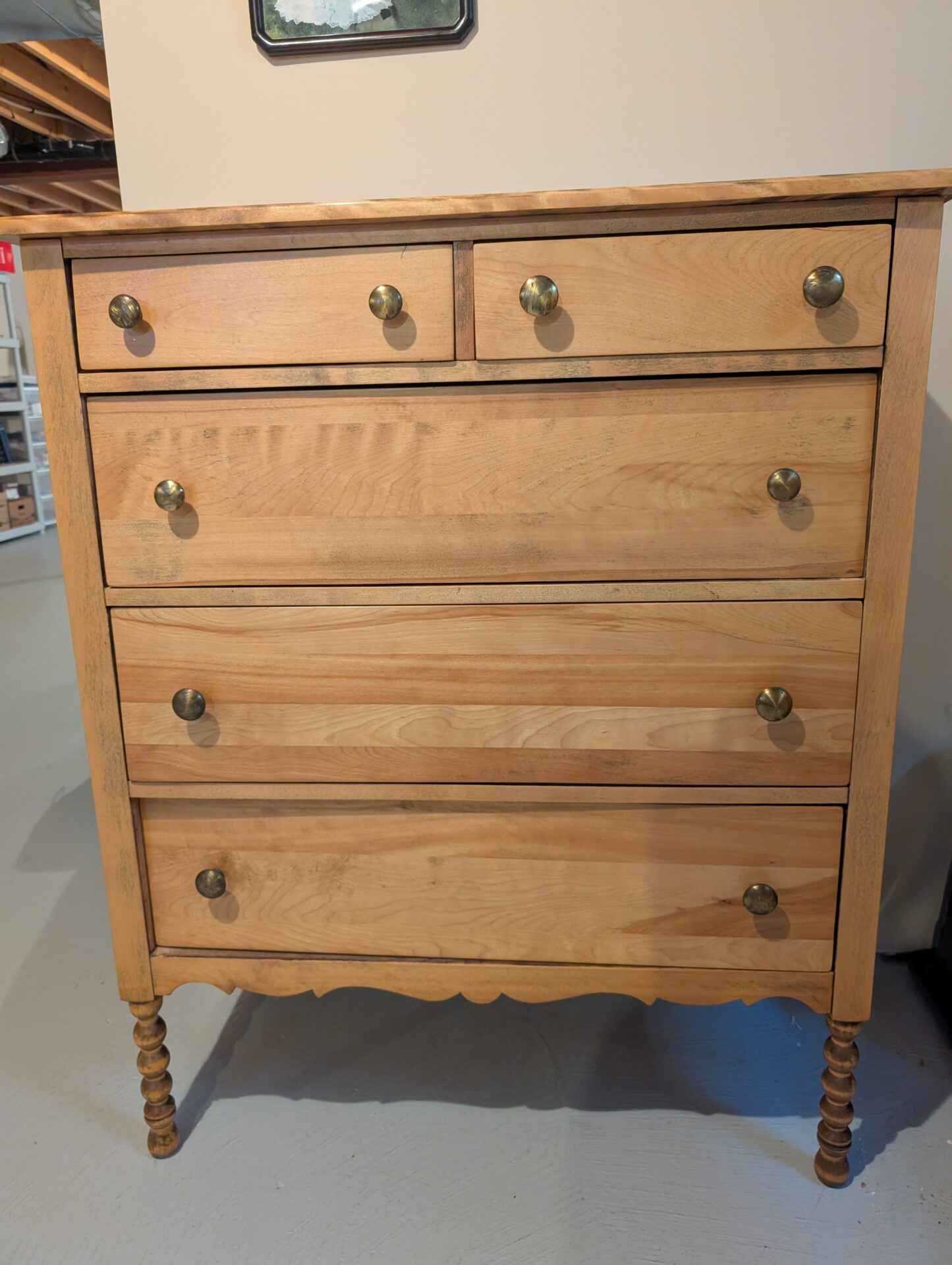 Dresser. Solid birch, over 80 years old and refinished. 44.5 inches tall, 19 inches deep and 36 inches wide.