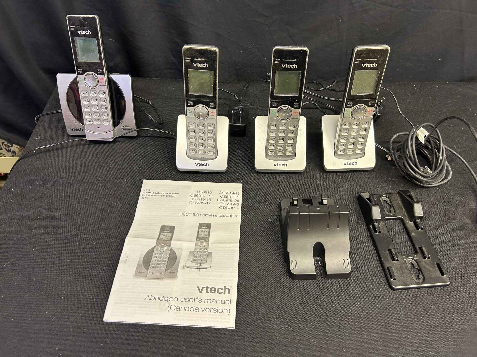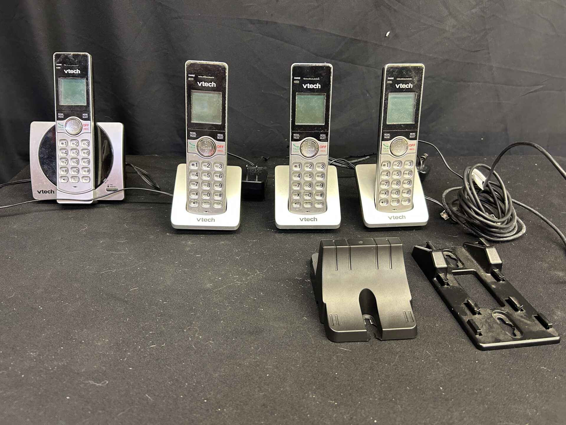 Vtech cordless telephone with 4 hand sets and two wall mounts. All charging cords included. DECT 6.0 model
