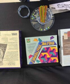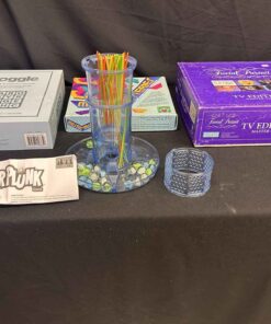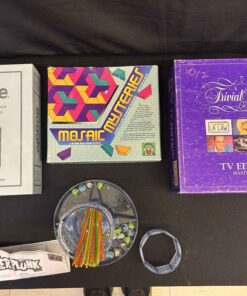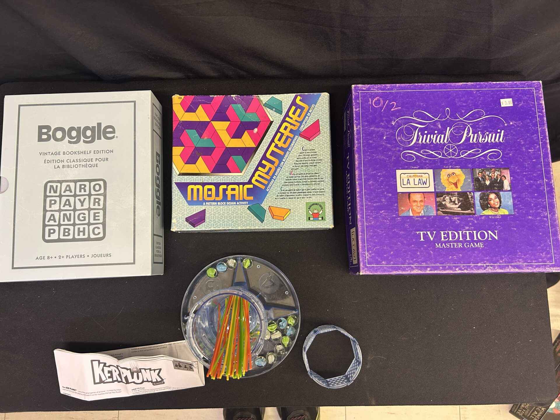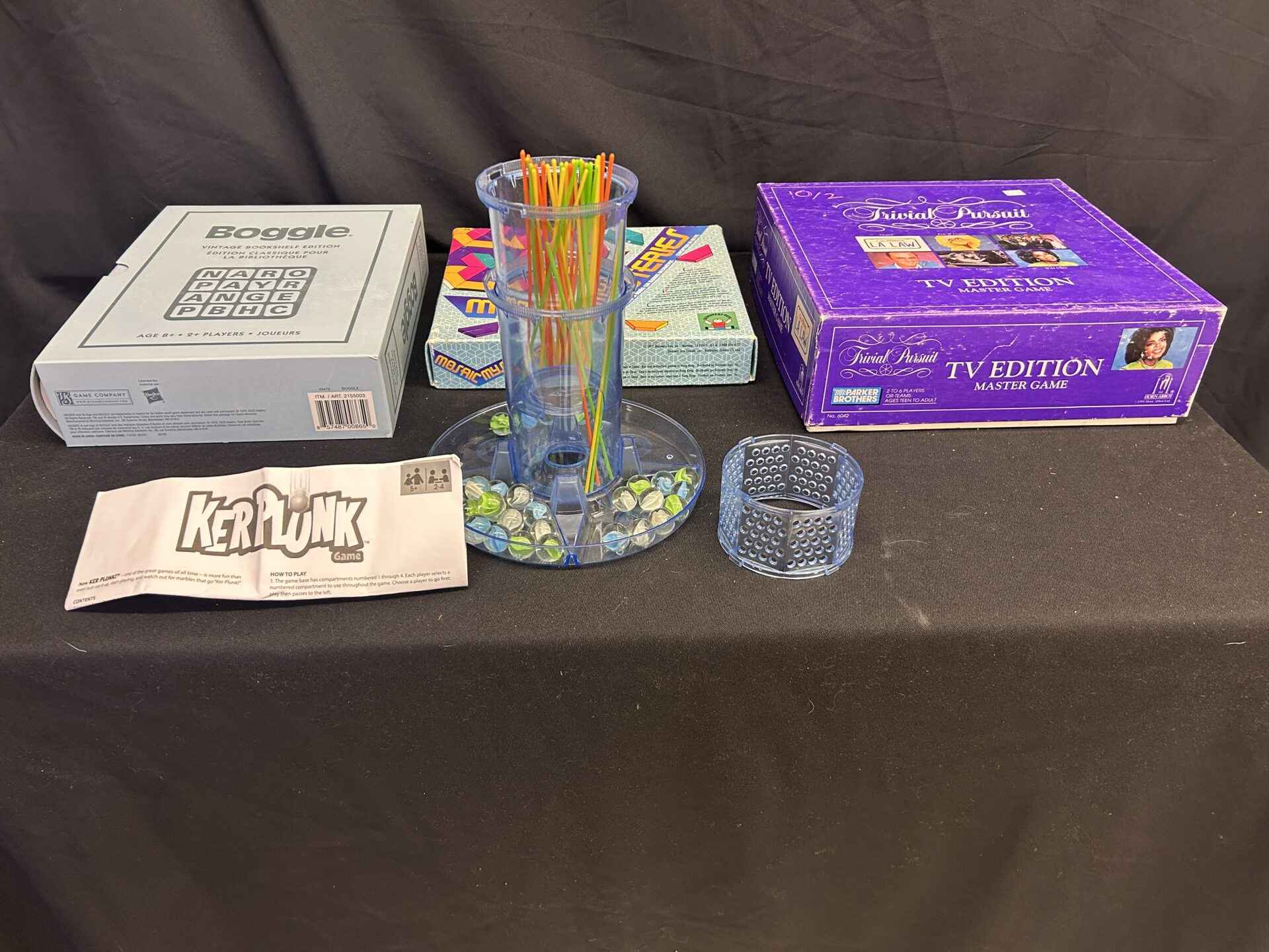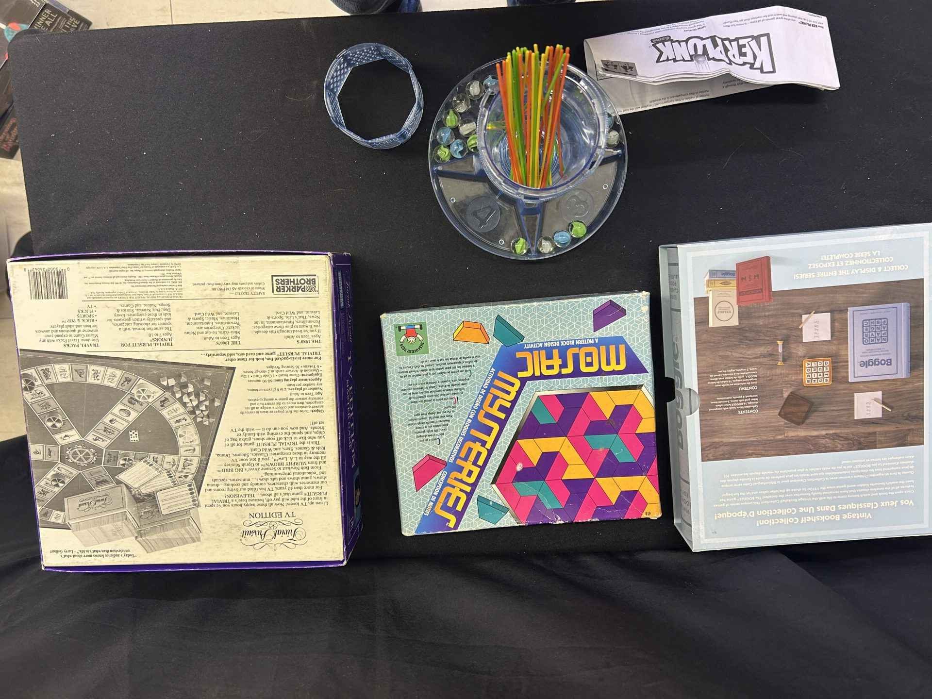 4 games. Boggle vintage bookshelf edition. Mosaic Mysteries – pattern block design activity. Trivial Pursuit – TV edition. Kerplunk.