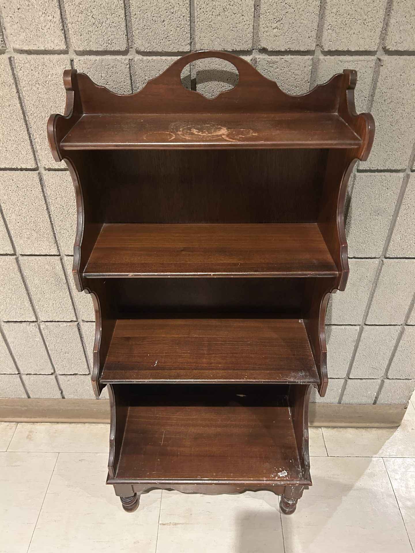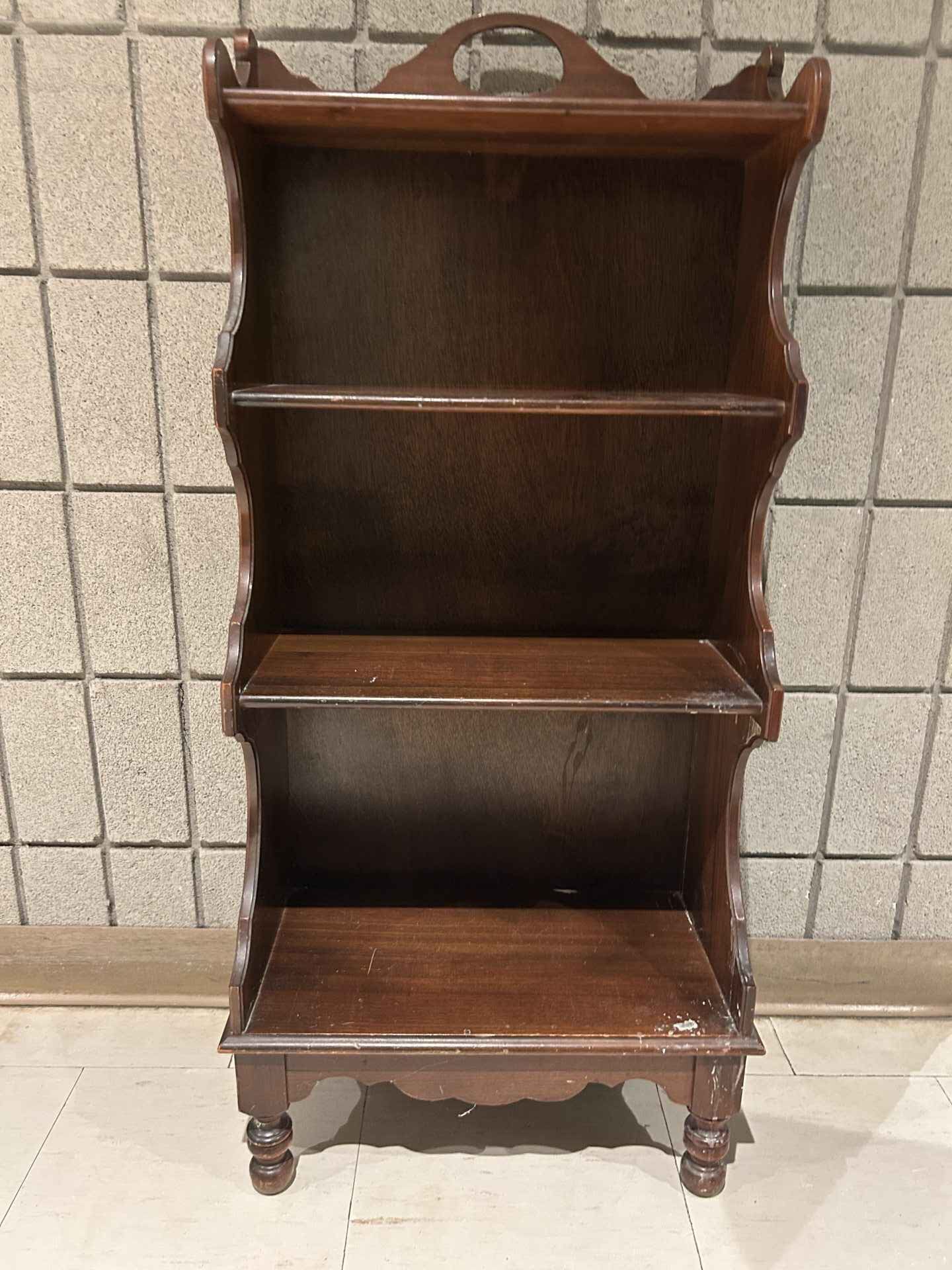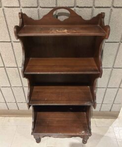 Small shelving unit. 39″ high x 8″ deep x 17.5″ wide.