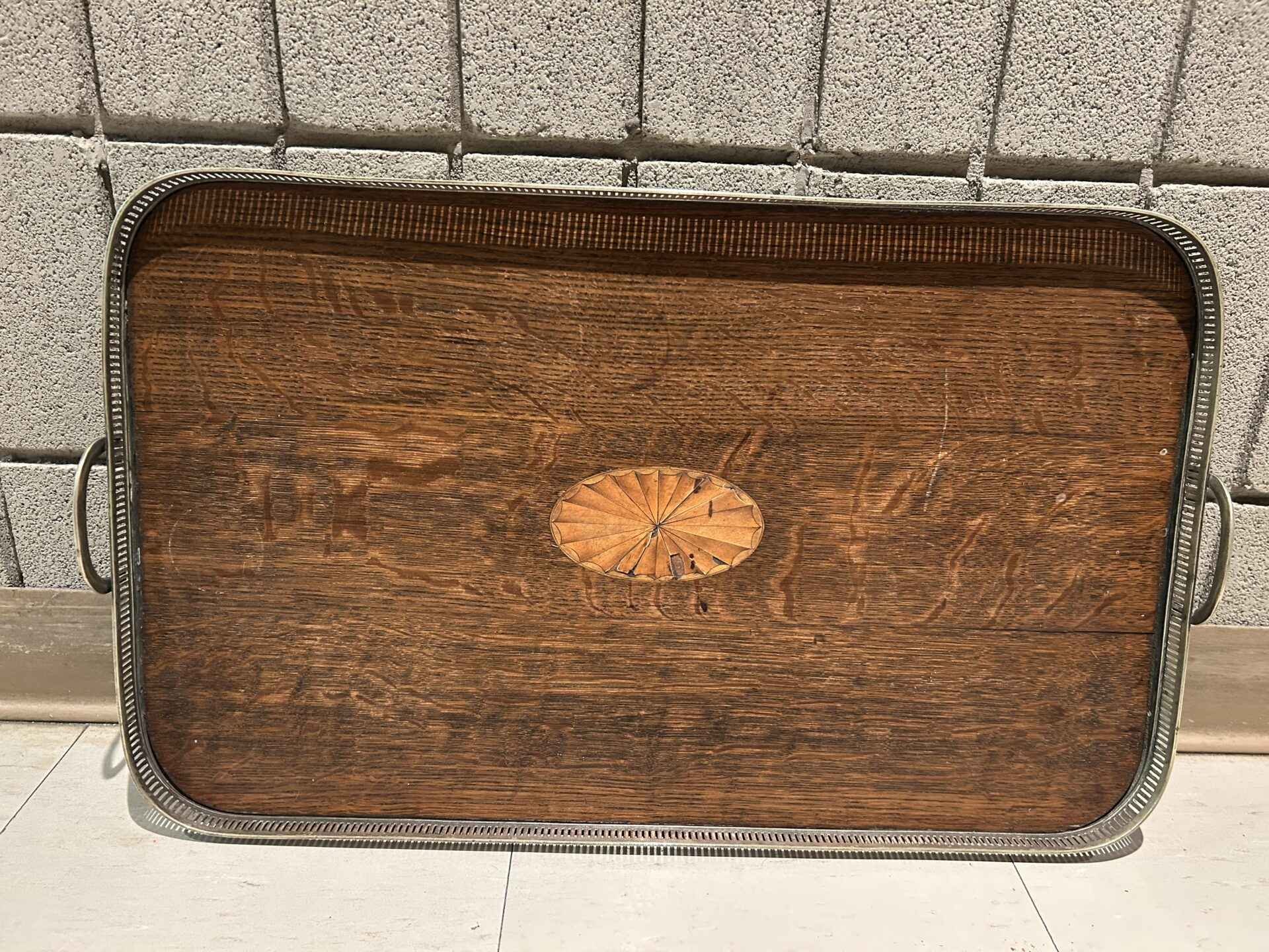 Inlaid wood tray, looks vintage. Absolutely beautiful! 25″ x 15″