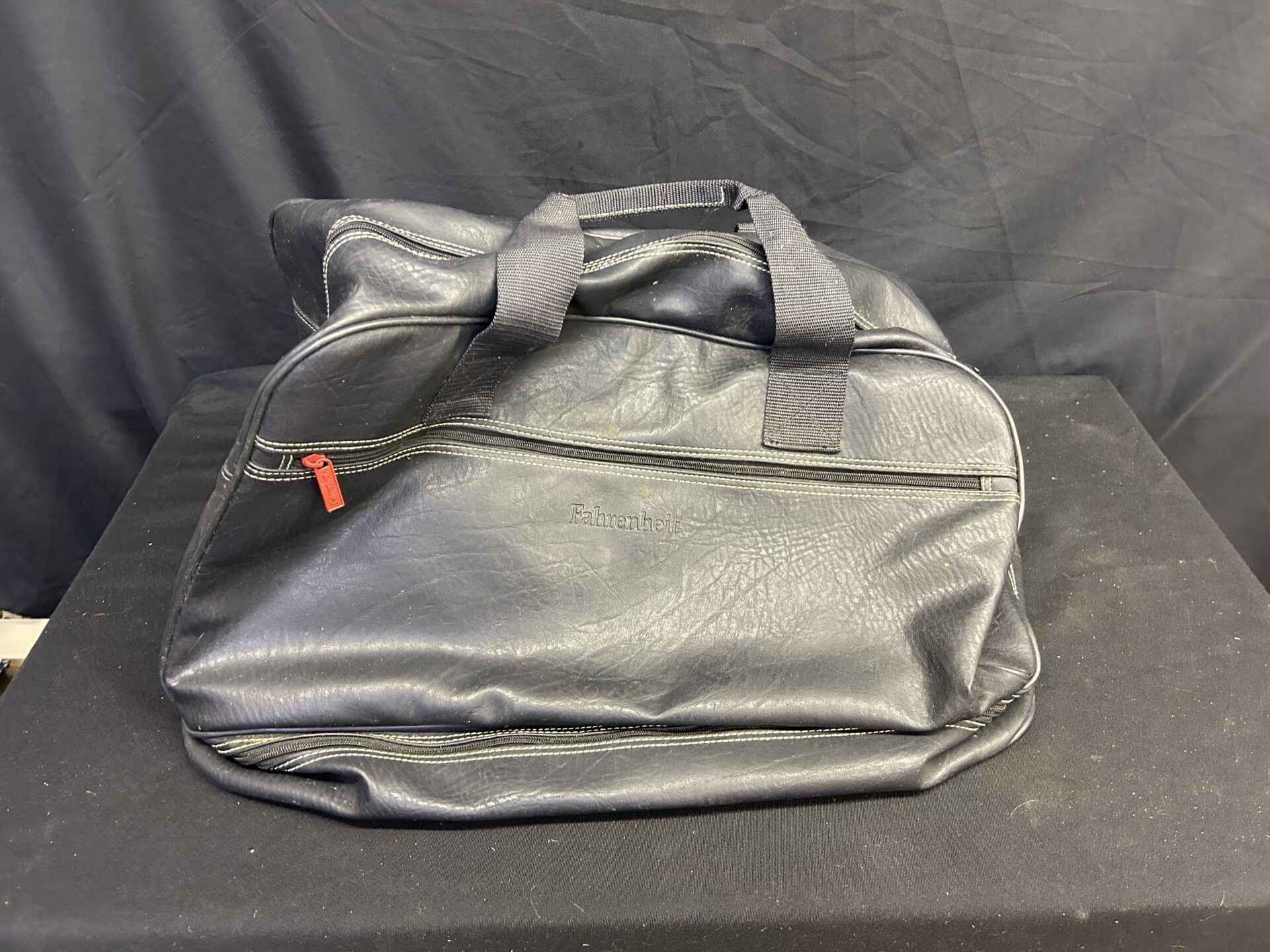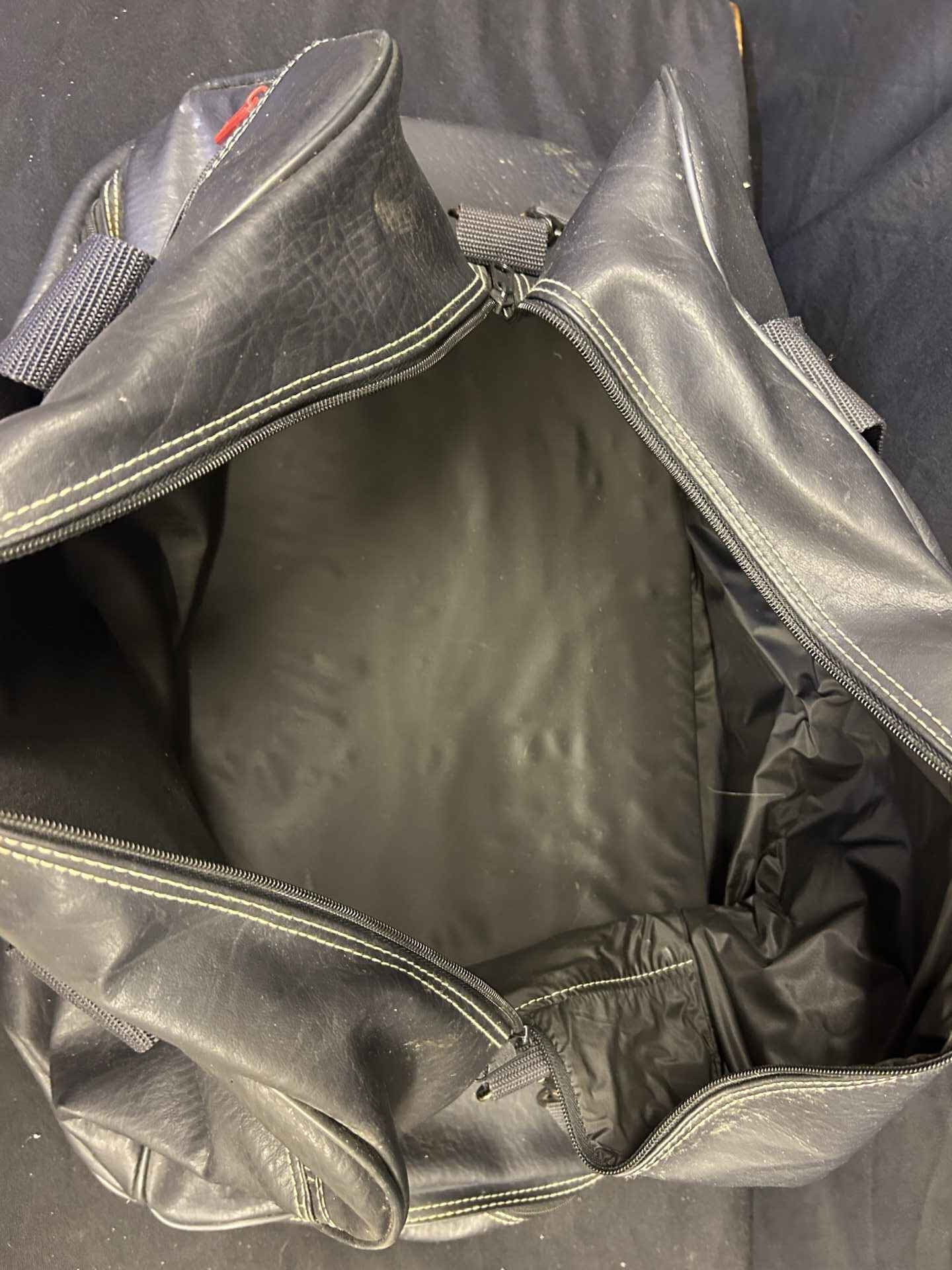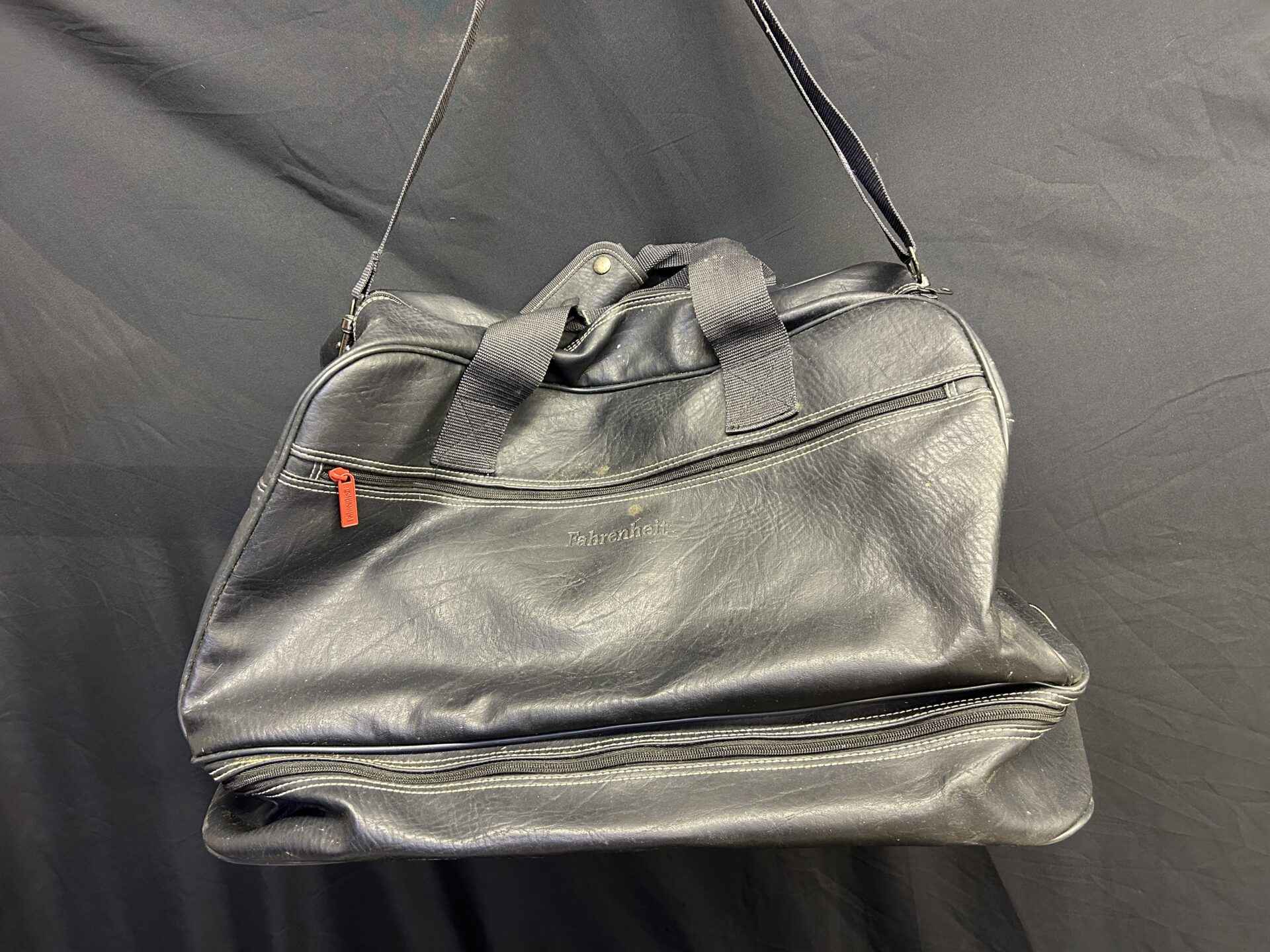 Leather duffle bag in good condition. Fahrenheit brand. Bottom measures 21″ x 12″. Comes with shoulder strap.