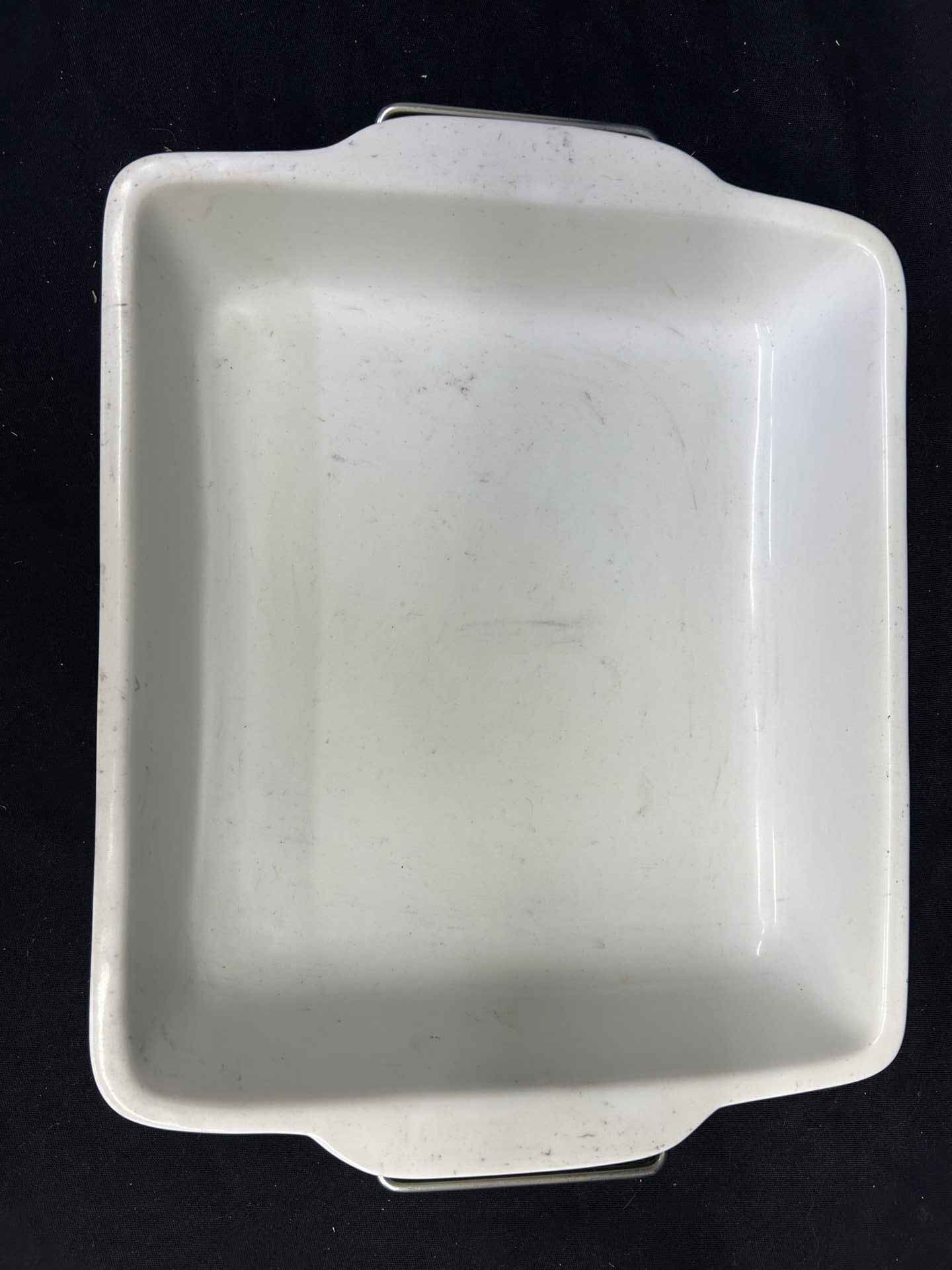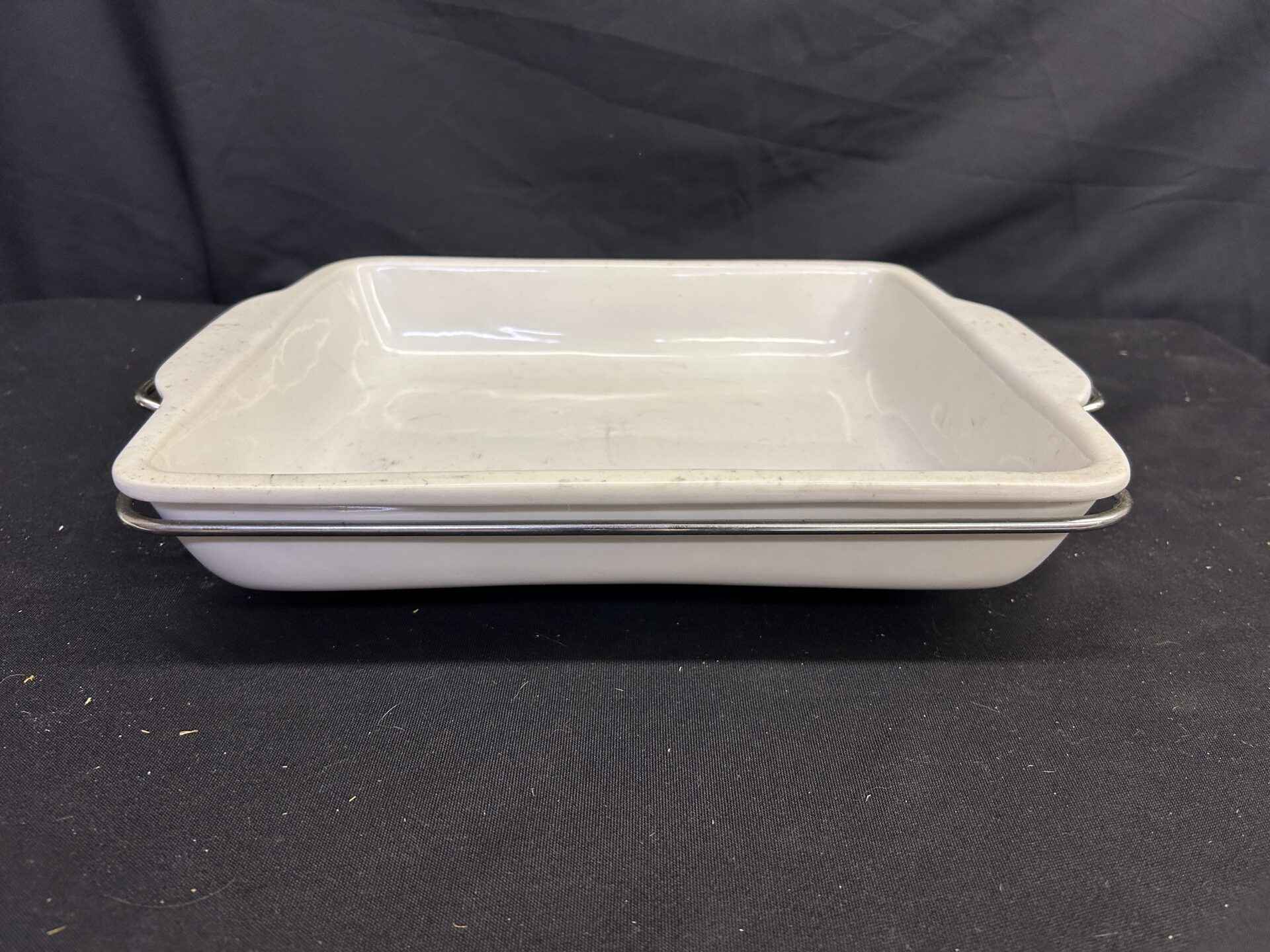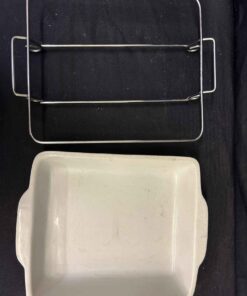 Ceramic pan in a wire holder/stand. 12 x 11″