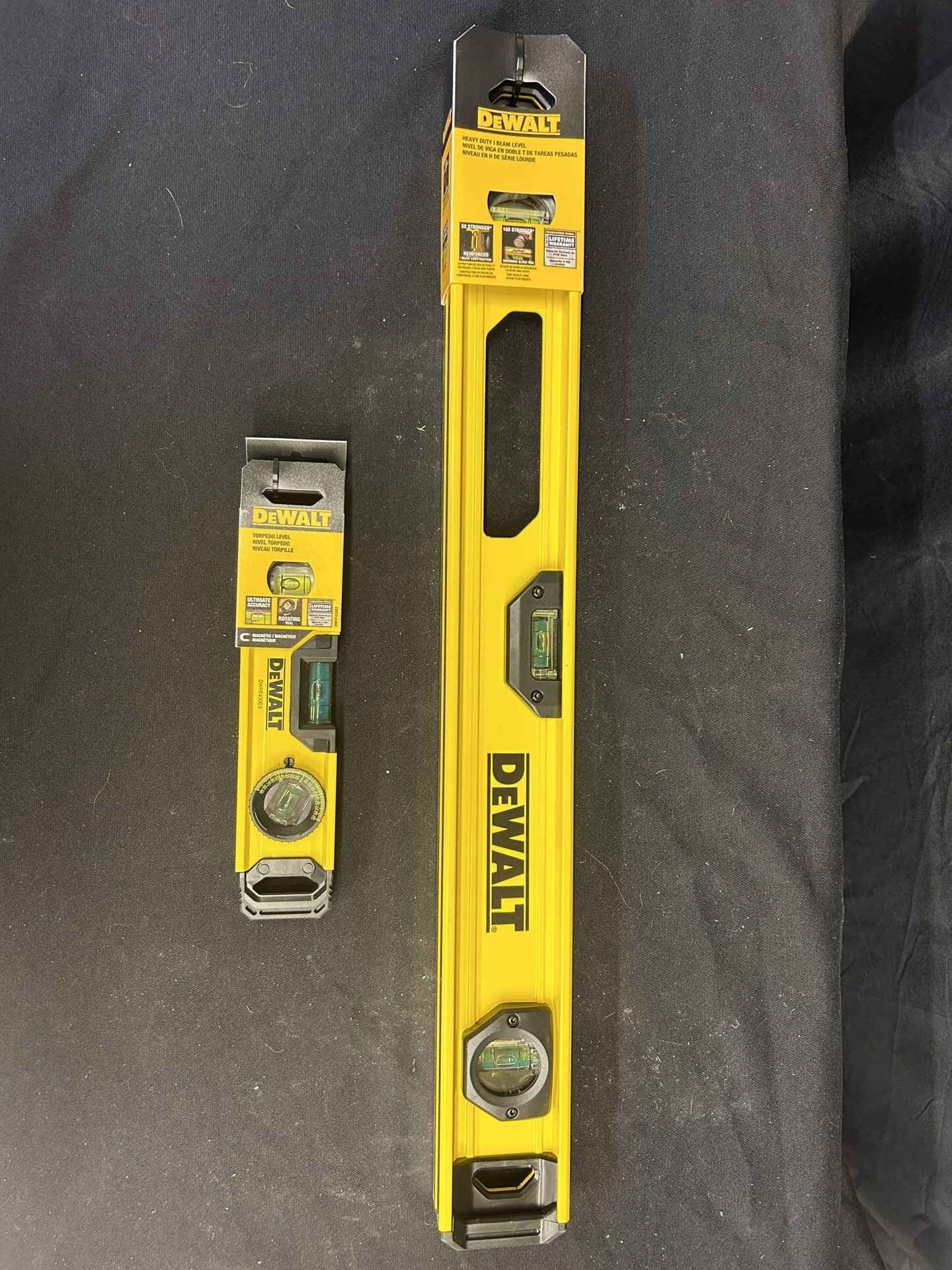 2 DeWalt levels. One 9″ magnetic torpedo level with rotating vial. One 24″ Heavy Duty Beam level. Both brand new.