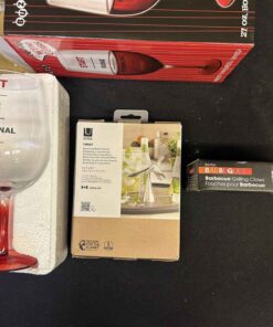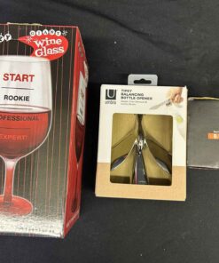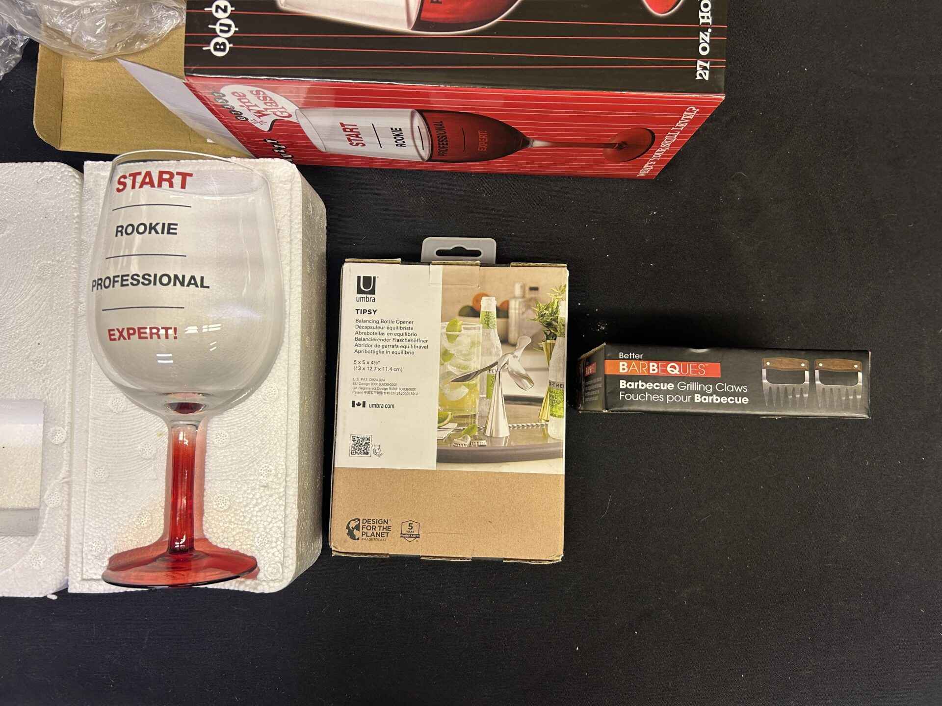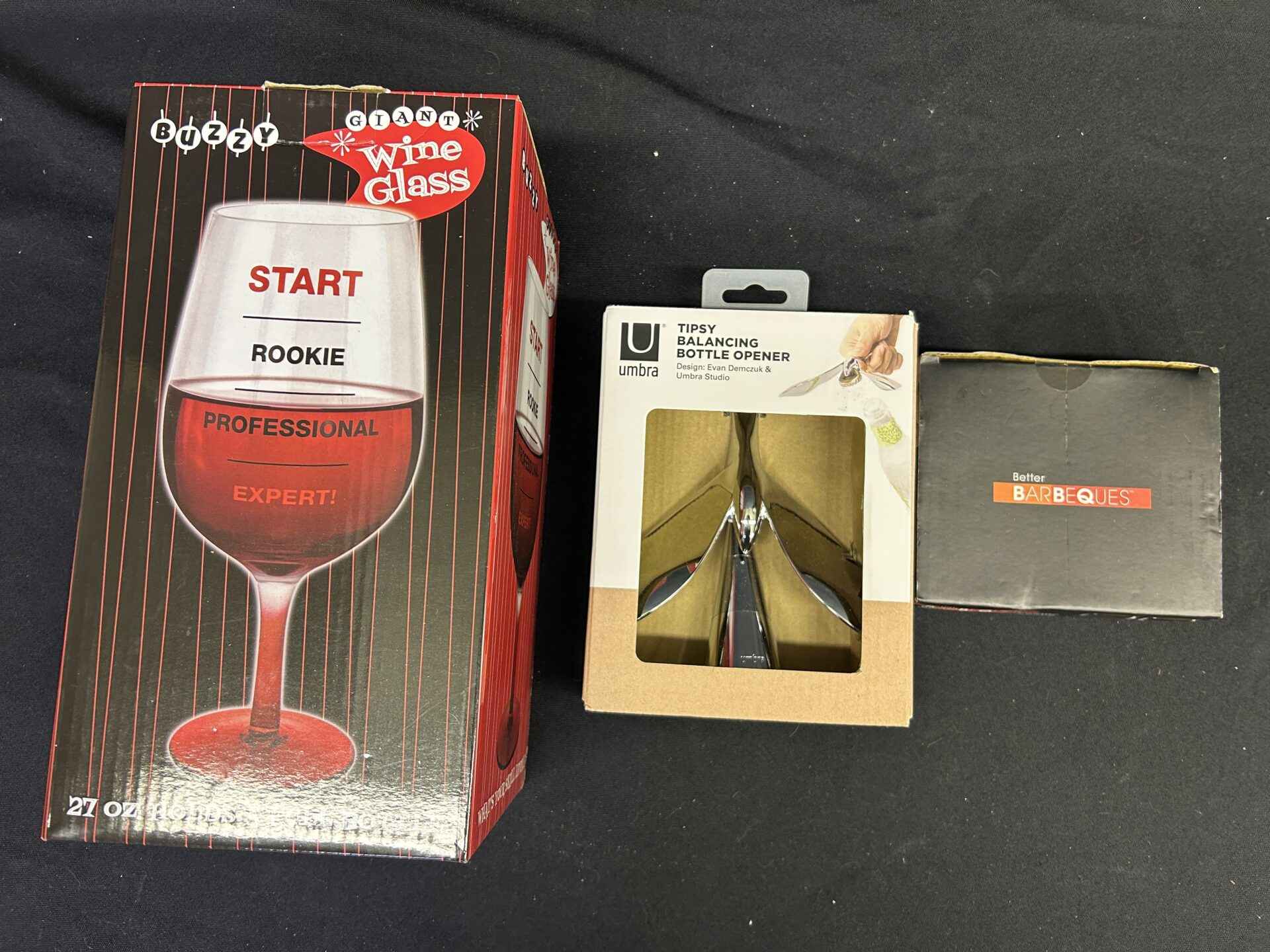 BBQ and Bar set includes large wine glass that will hold a bottle of wine. Tipsy balancing bottle opener. BBQ grilling claws for shredding meat.