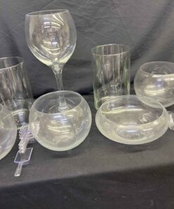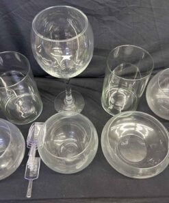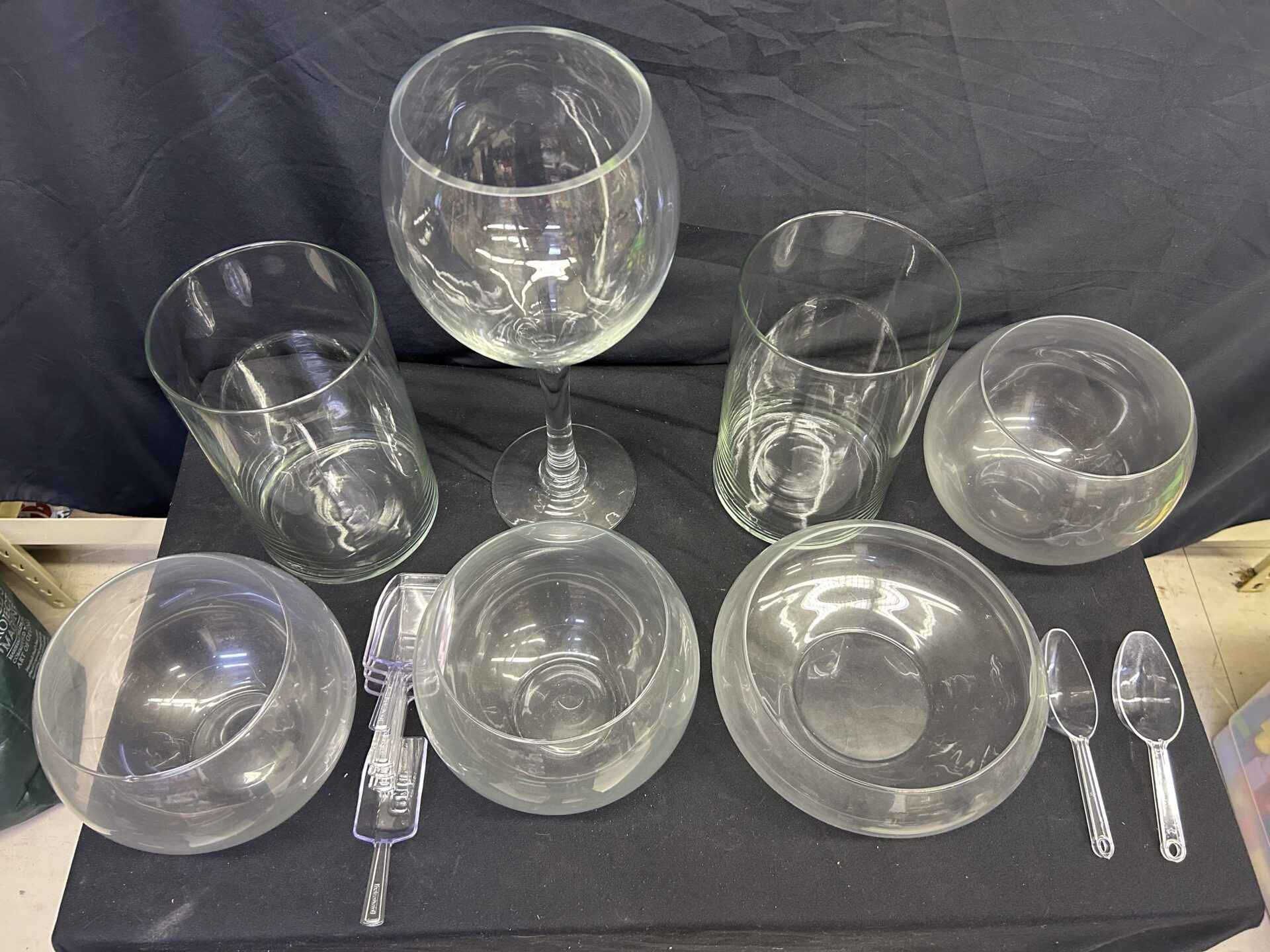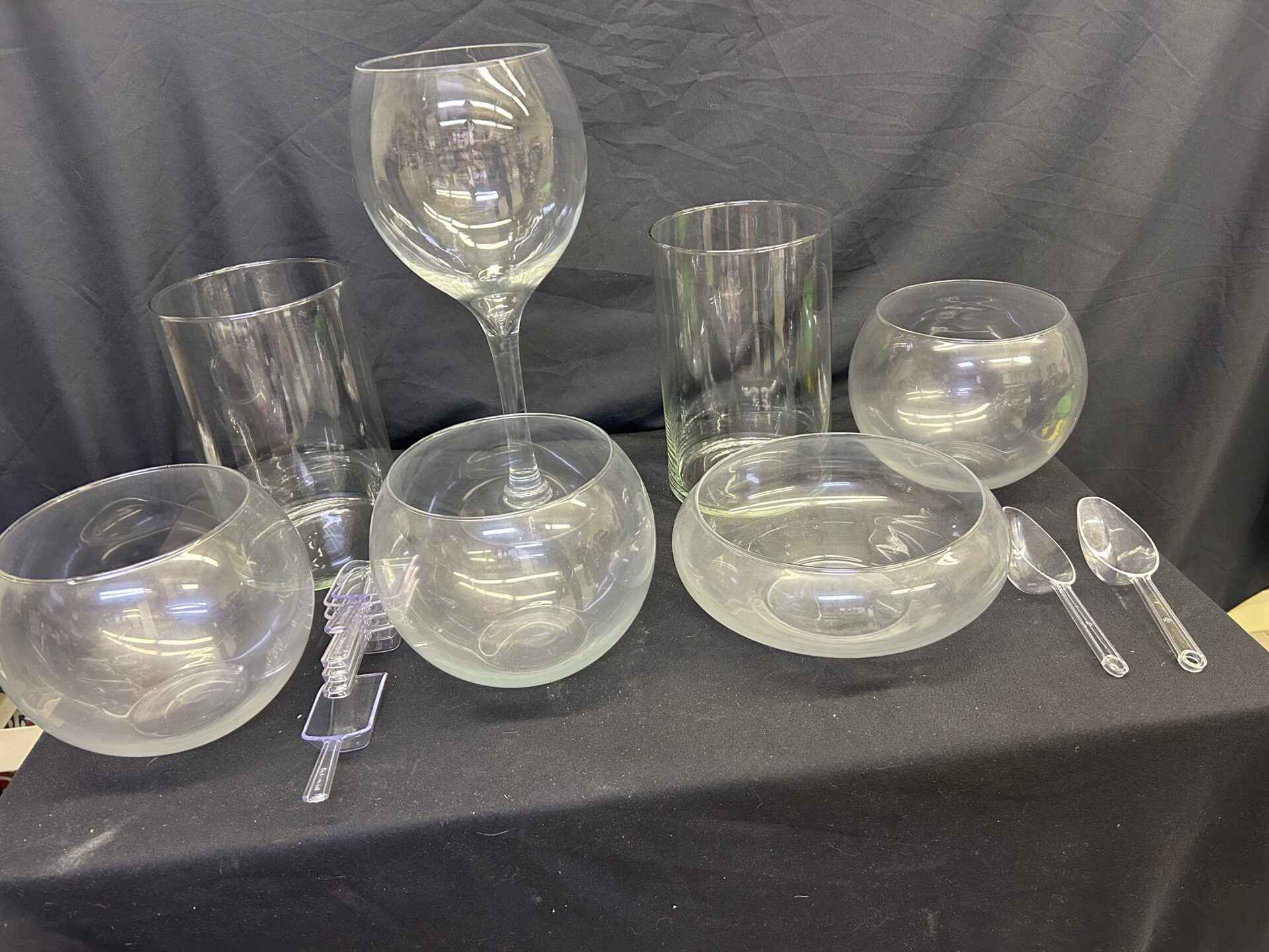 Glass bowls. Were used once for a wedding candy station. 3 @ 6.25″ dia x 6.5″ high. 1 @ 8″ dia. X 4″ high. 2 @ 6″ dia x 10″ high. Large wine glass style 16.5″ high x 6″ dia. Includes 7 scoops.