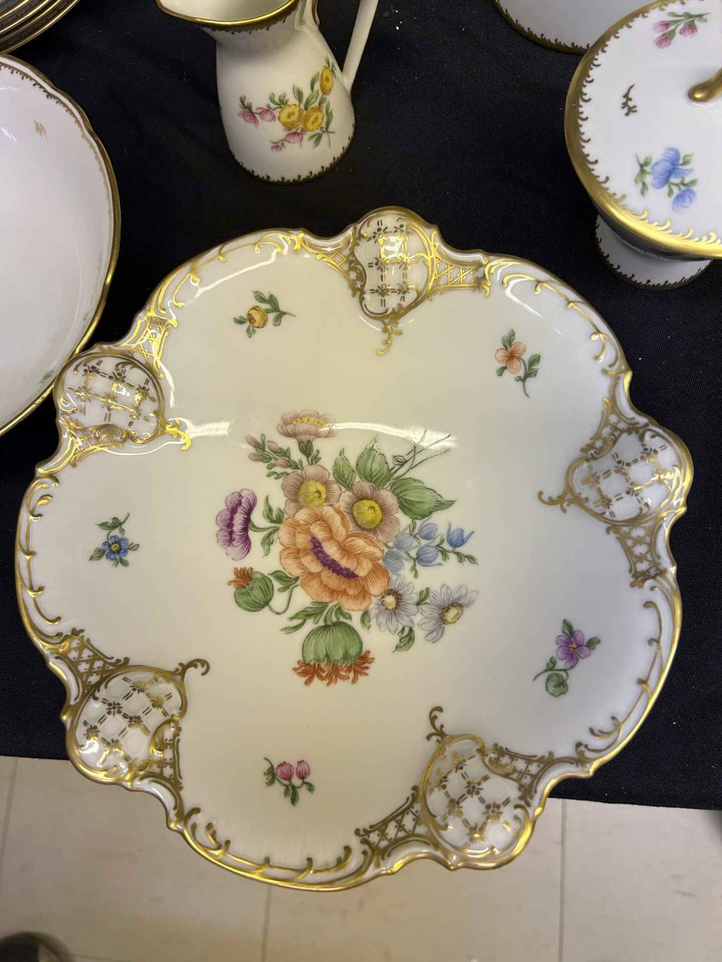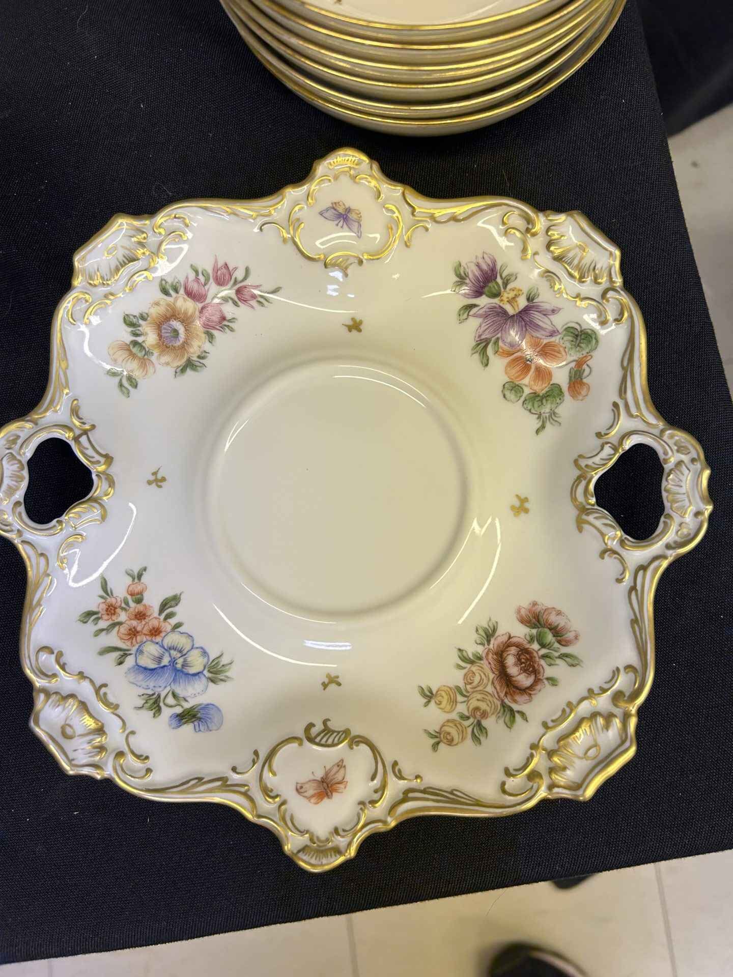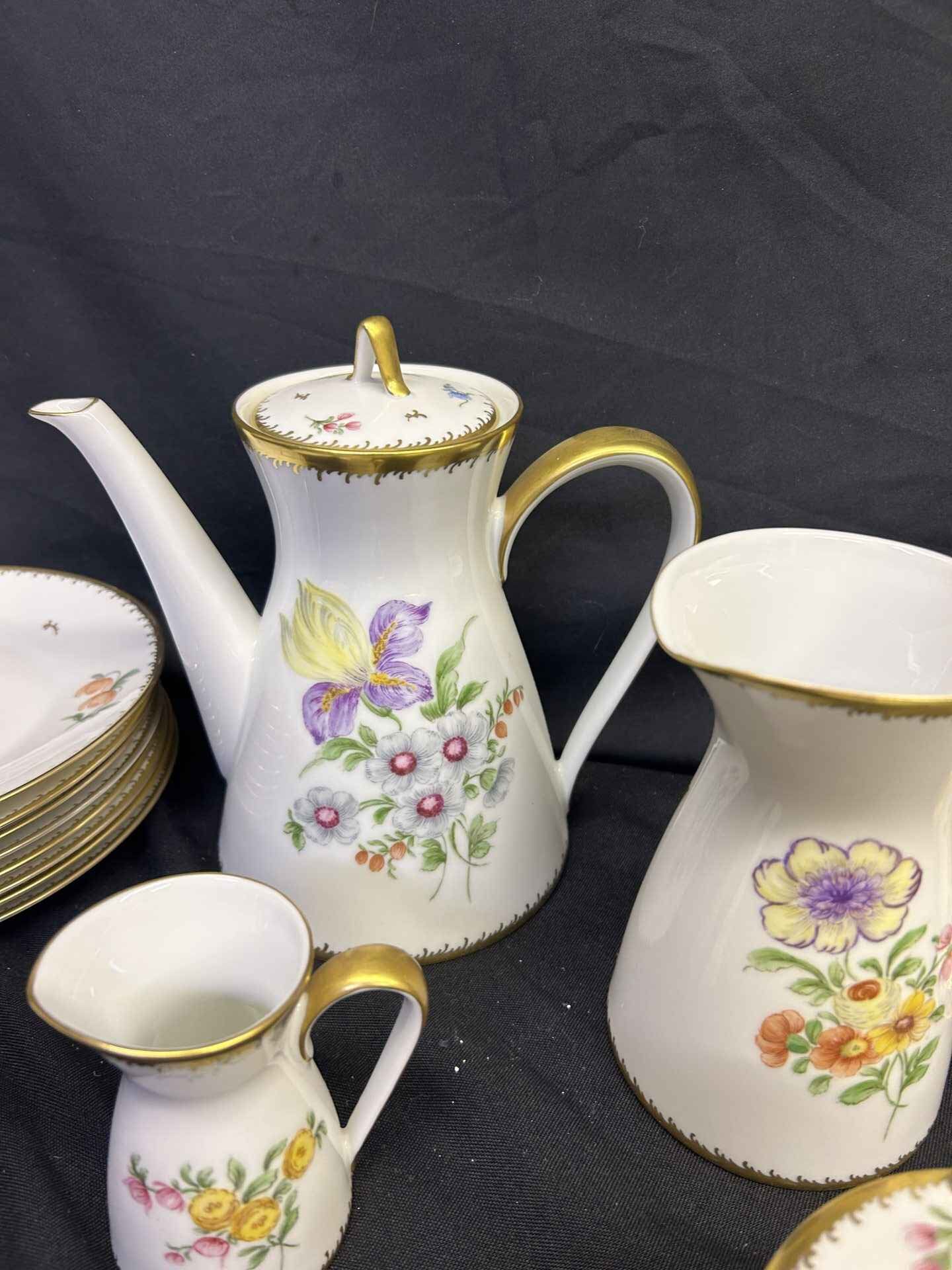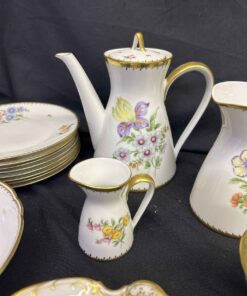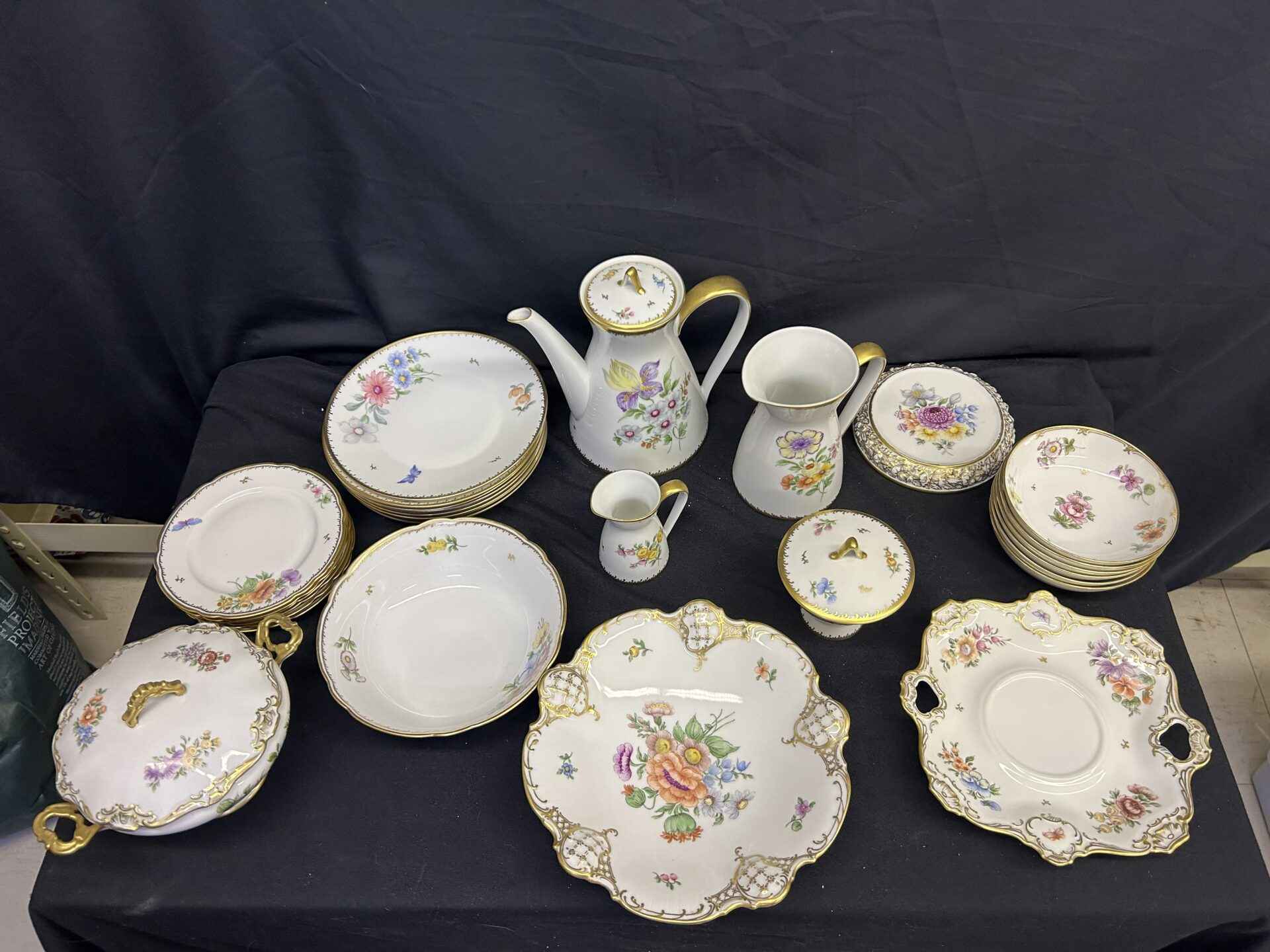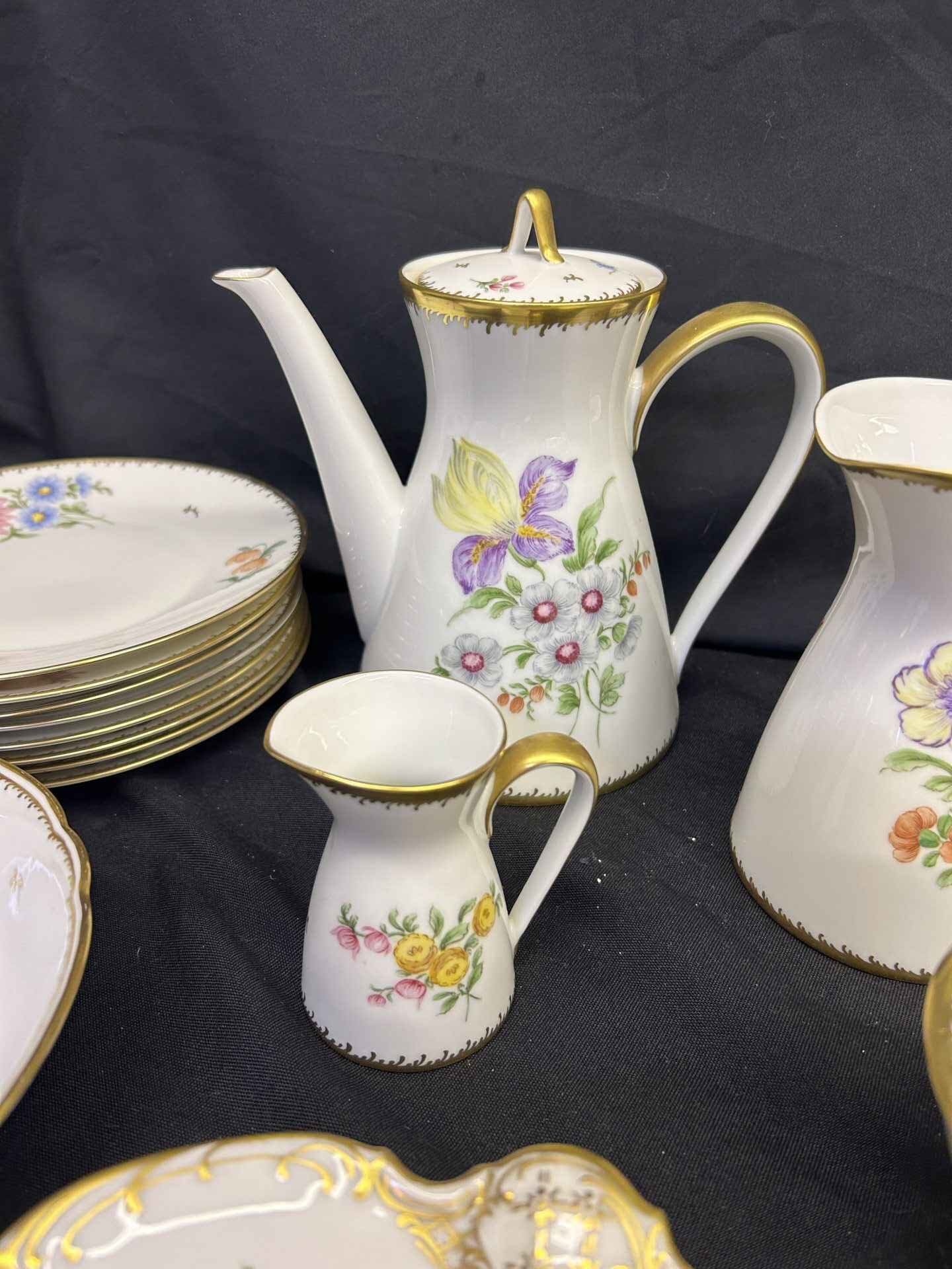 Rosenthal China set from Germany. Absolutely stunning!!! Each plate and bowl has a different flower. Includes tea pot and stand, milk pitcher, cream pitcher, sugar bowl, pedestal candy dish, 6 bowls, 6 small plates, 8 salad plates, pedestal serving dish, square plate, serving bowl.