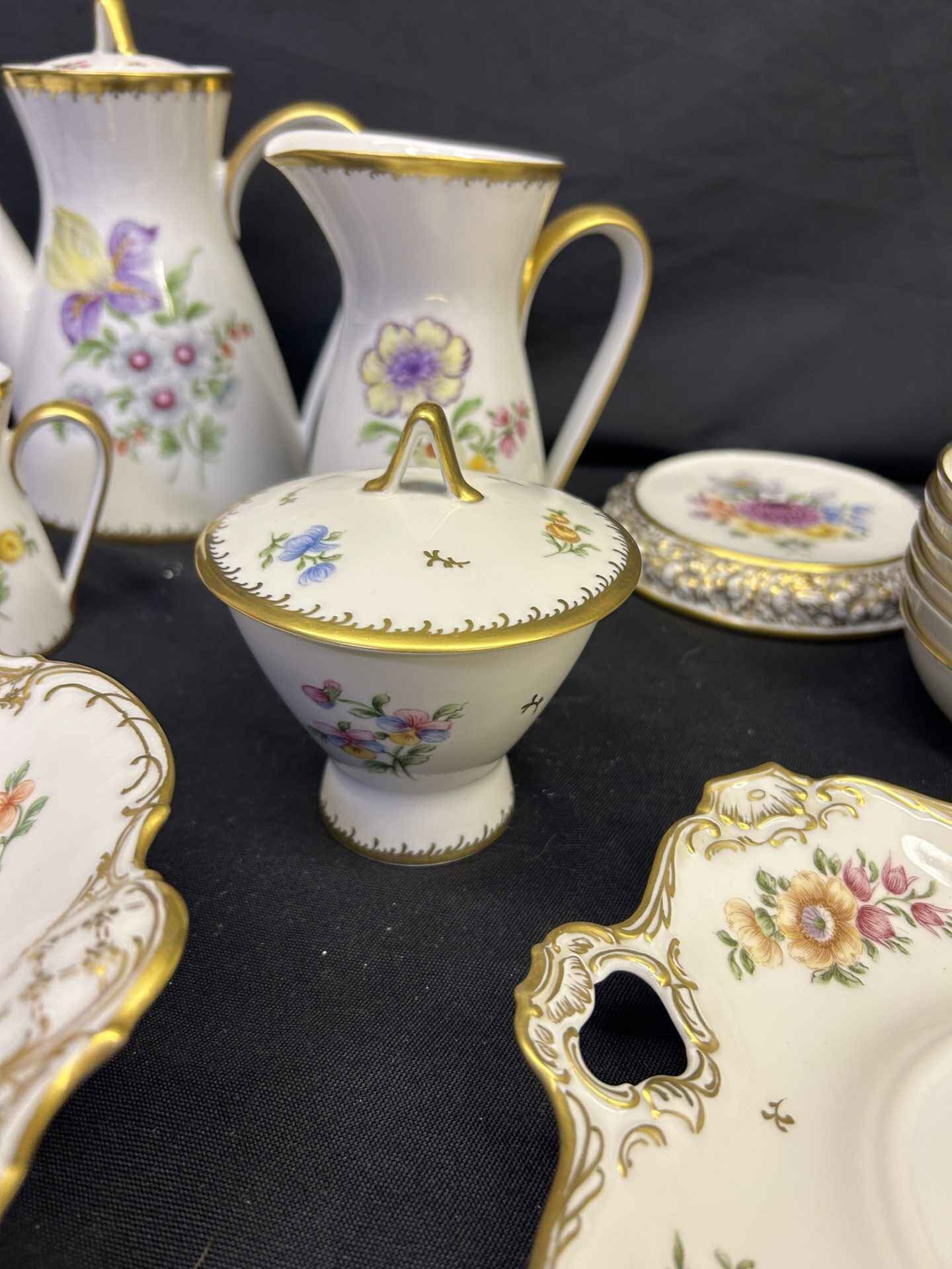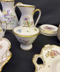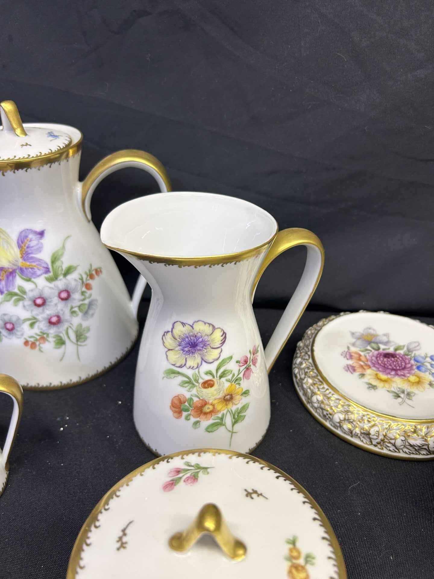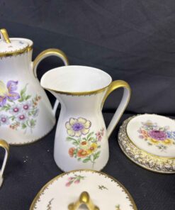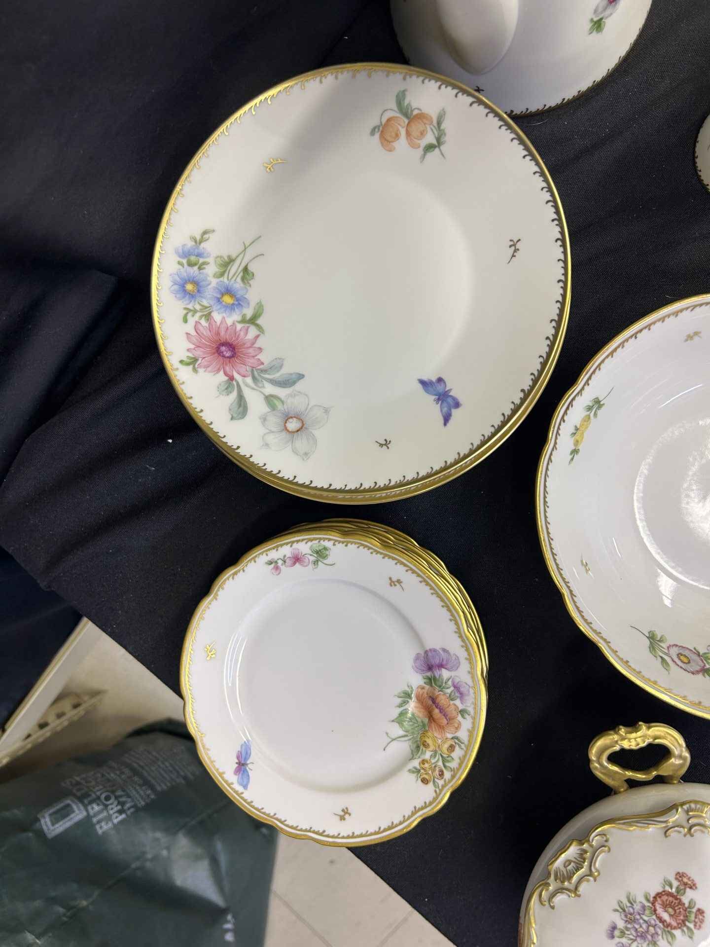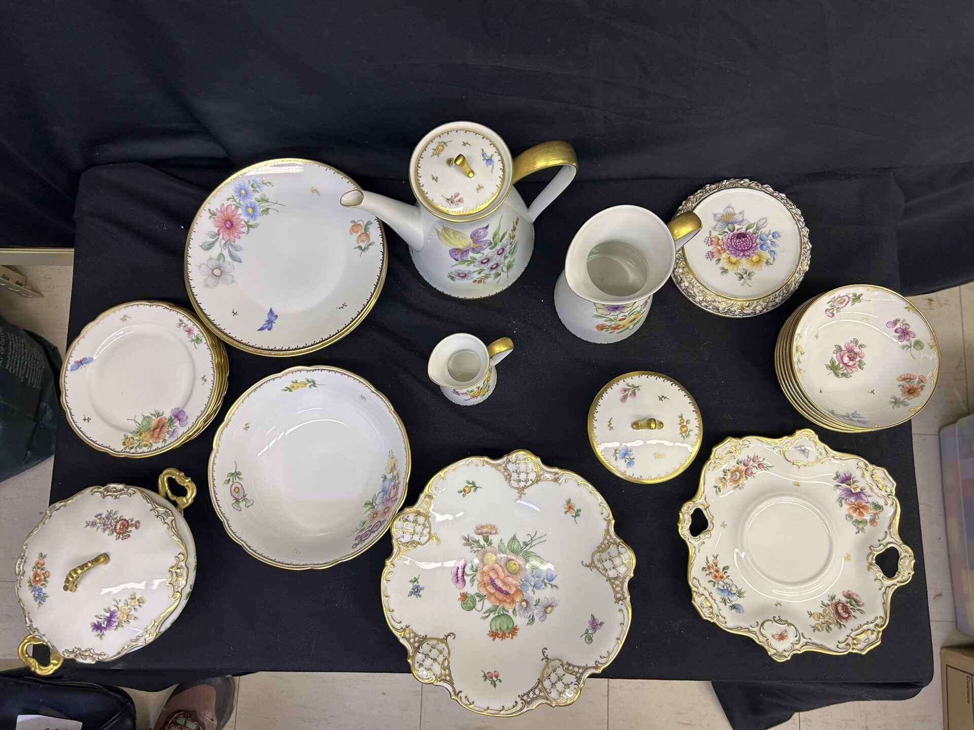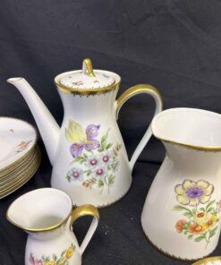 Rosenthal China set from Germany. Absolutely stunning!!! Each plate and bowl has a different flower. Includes tea pot and stand, milk pitcher, cream pitcher, sugar bowl, pedestal candy dish, 6 bowls, 6 small plates, 8 salad plates, pedestal serving dish, square plate, serving bowl.
