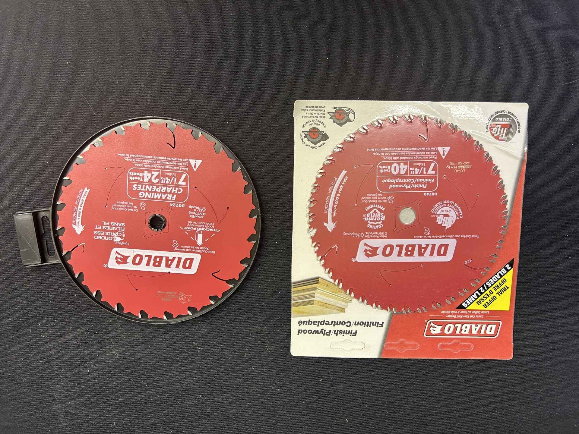 2 Diablo Saw blades. Both 7-1/4″. One 24 teeth framing. 2 are 40 teeth finish/plywood. All brand new.