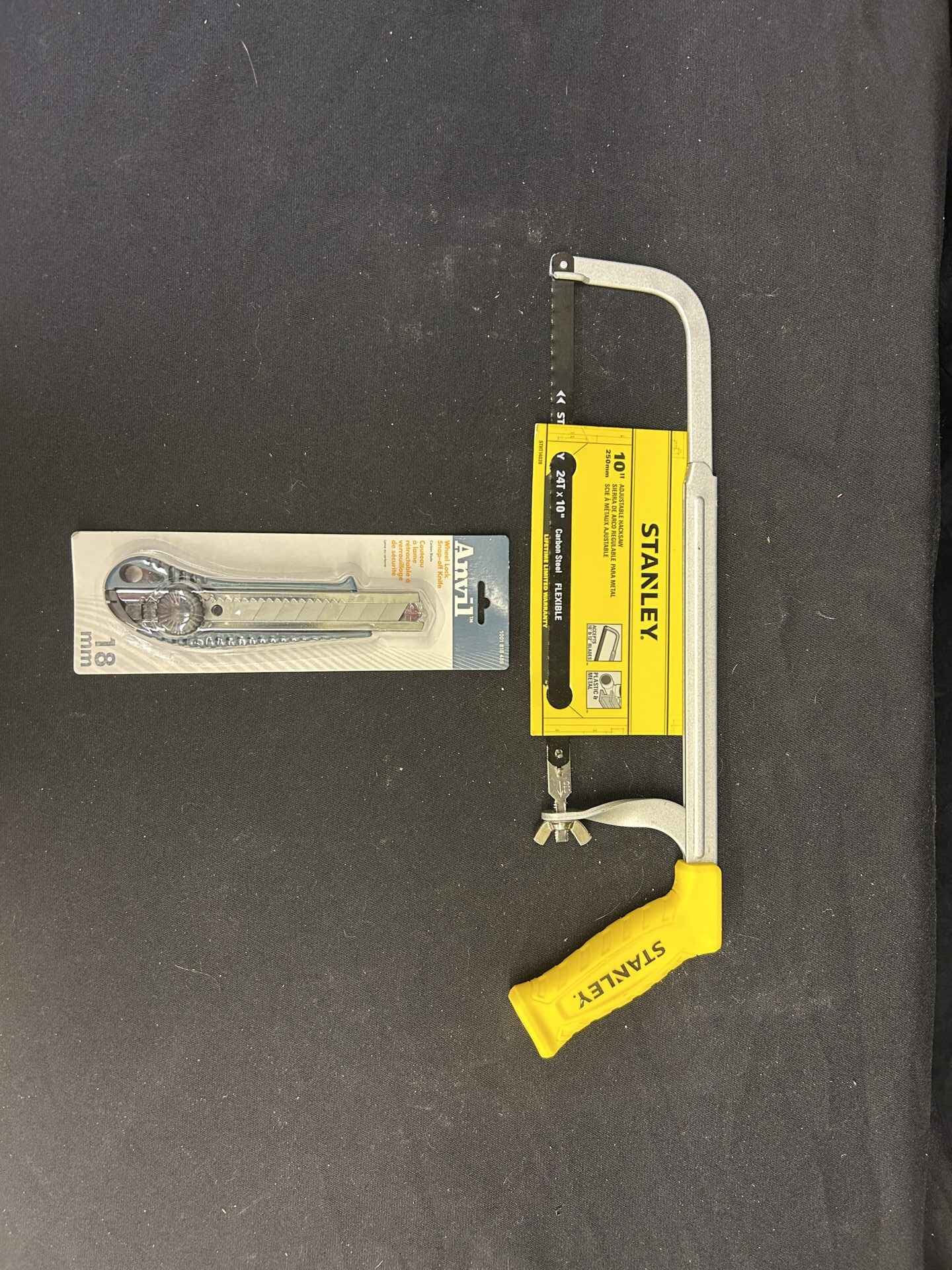 Stanley 10″ adjustable hack saw. Brand new. Anvil wheel lock snap-off knife. 18 mm. Brand new.