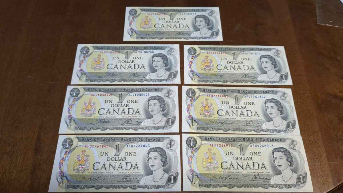 7 non circulated Canada 1 dollar bills