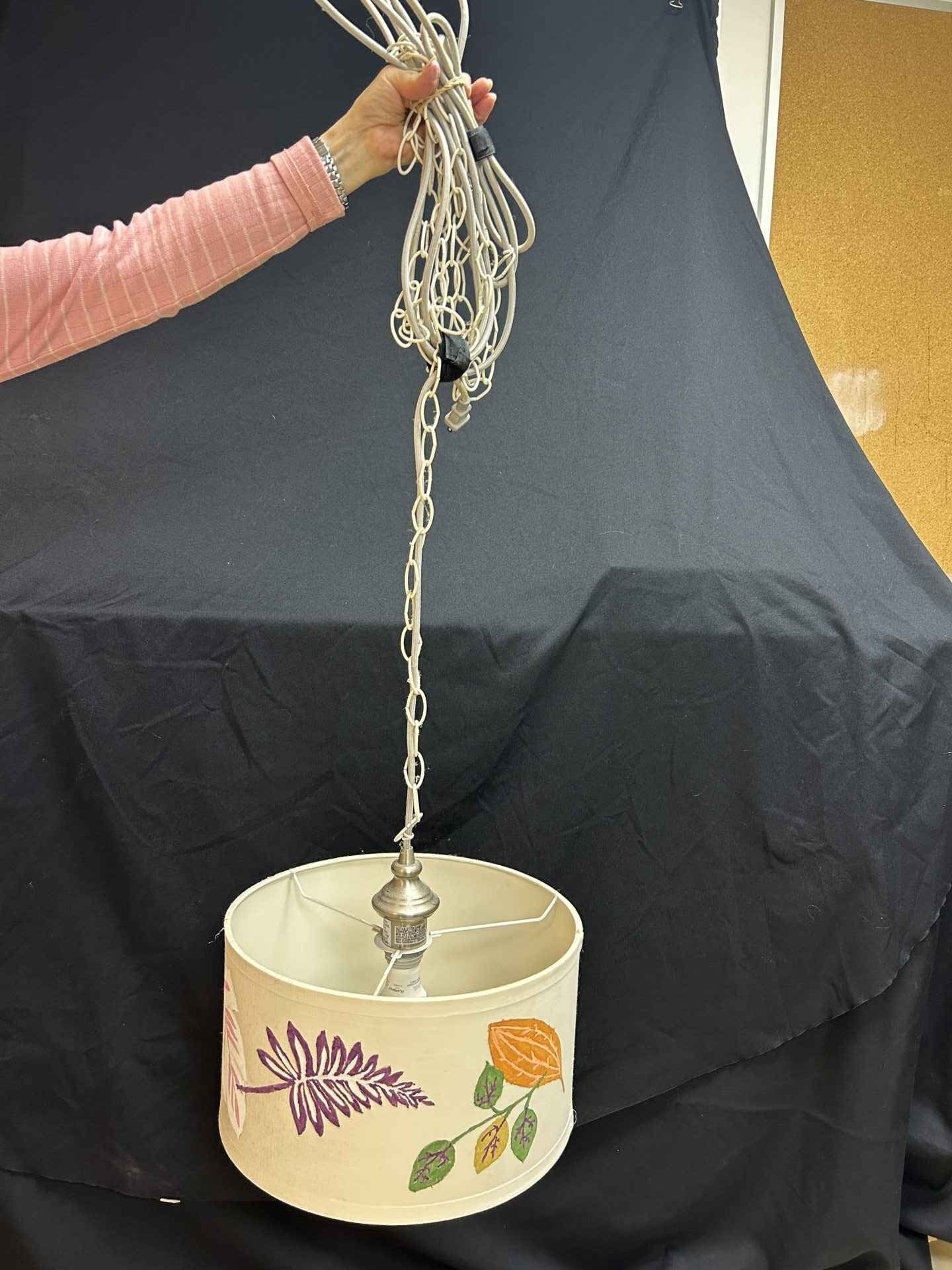 Hanging lamp, hand painted, plug in cord, cord is 184″+ long. 14″ diameter.