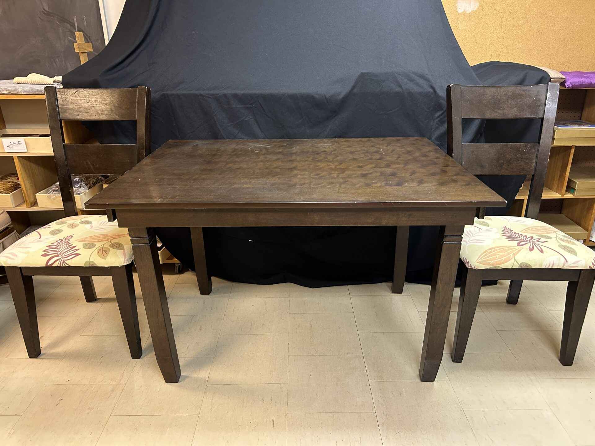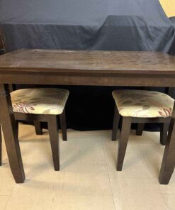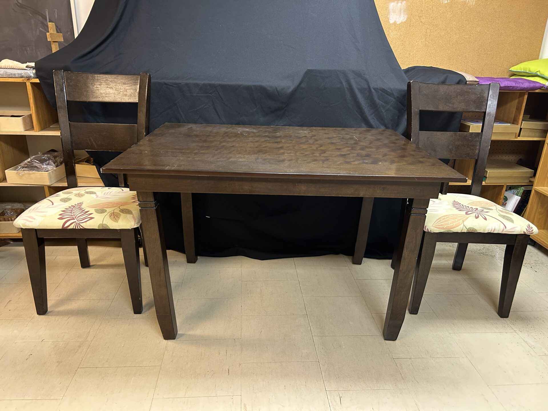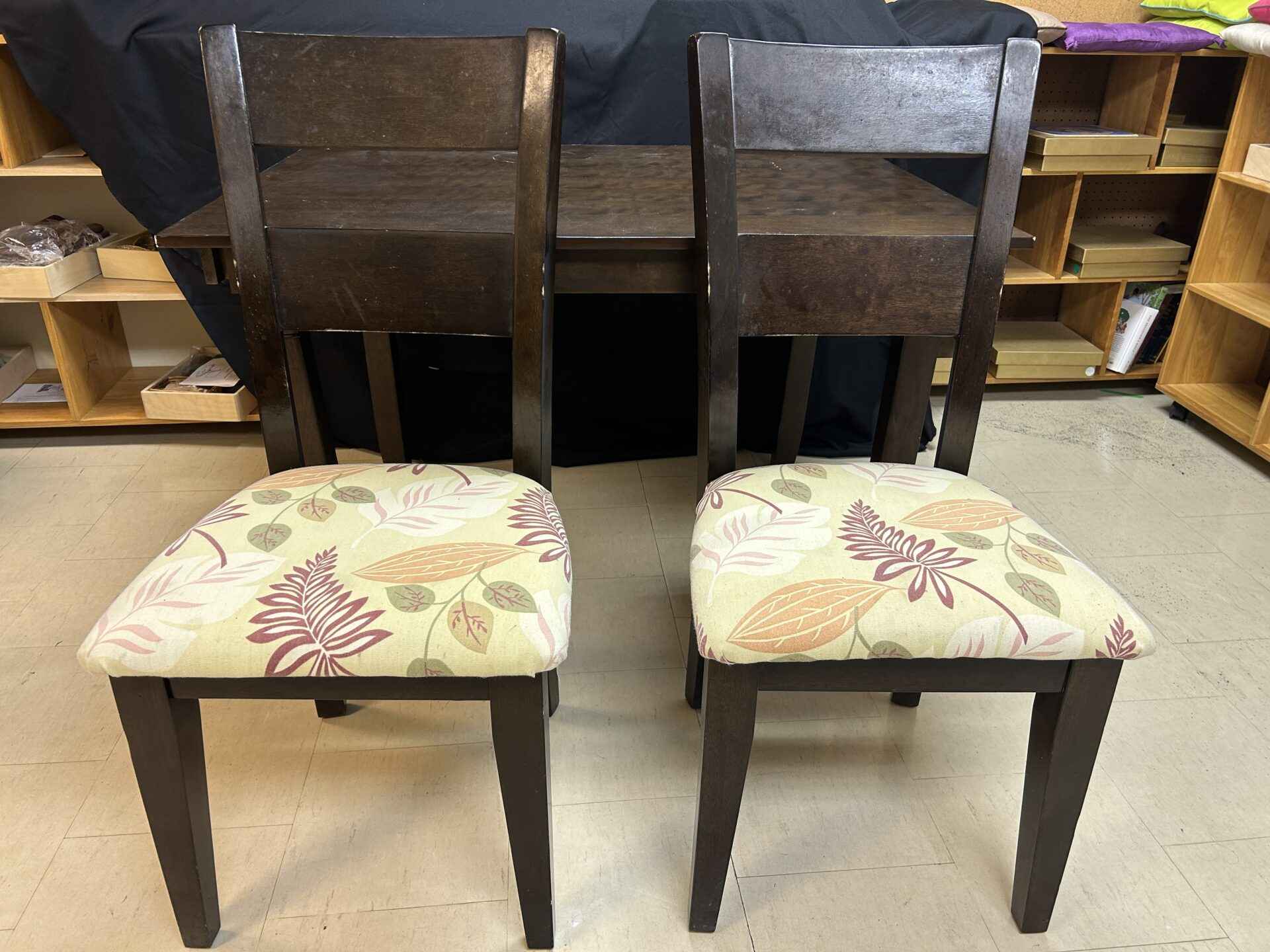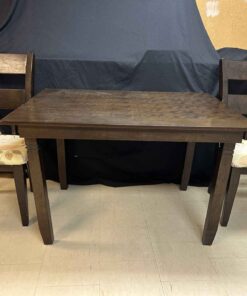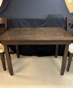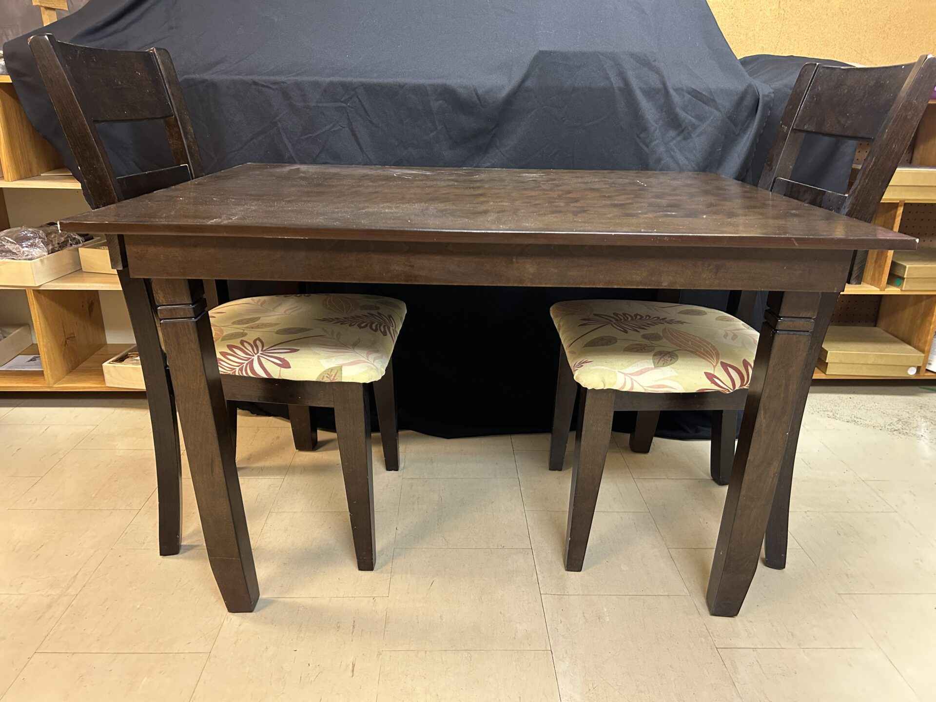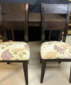 Small wooden dining table and two upholstered chairs. 4′ wide x 3′ deep x 30″ high.