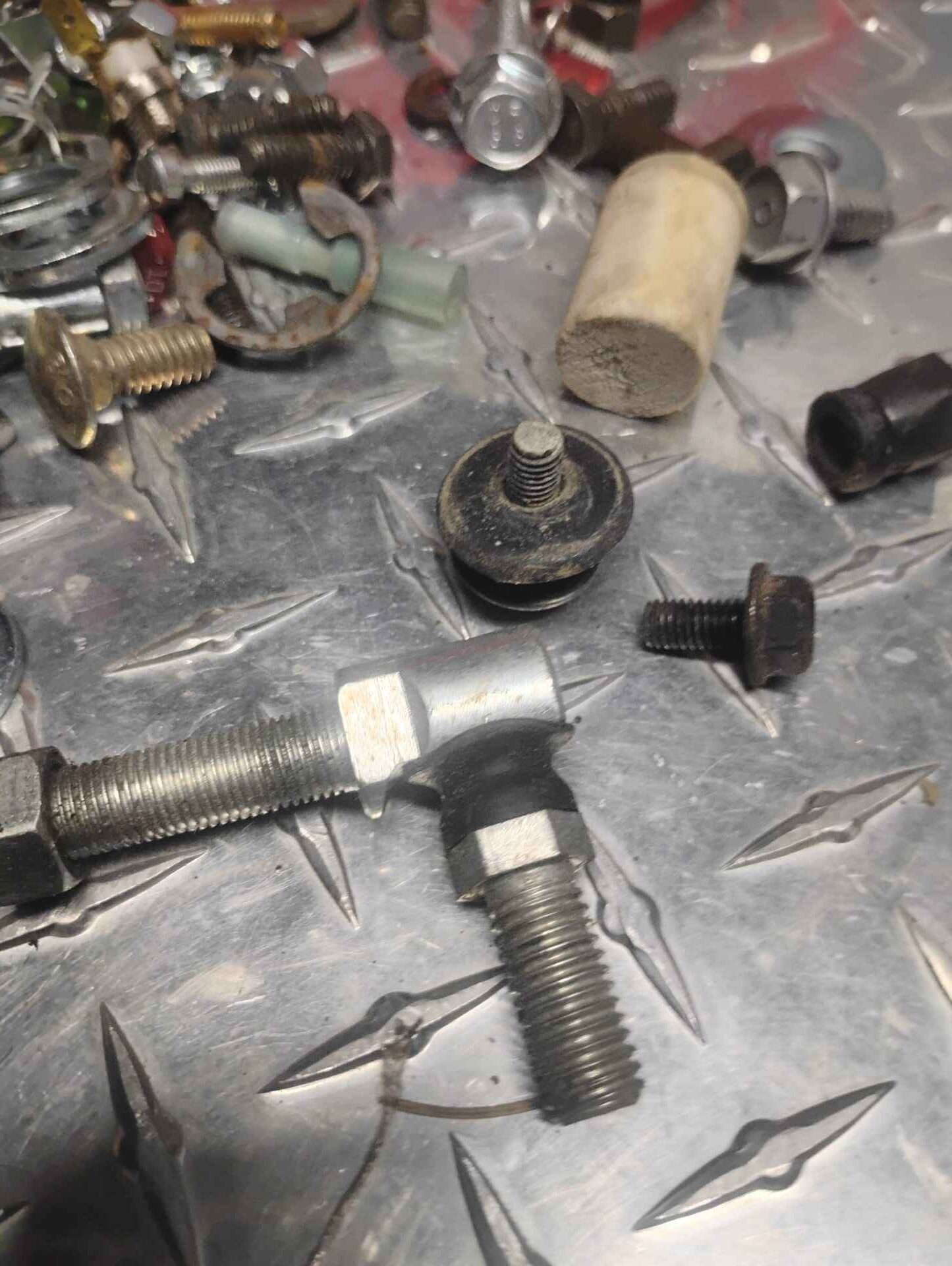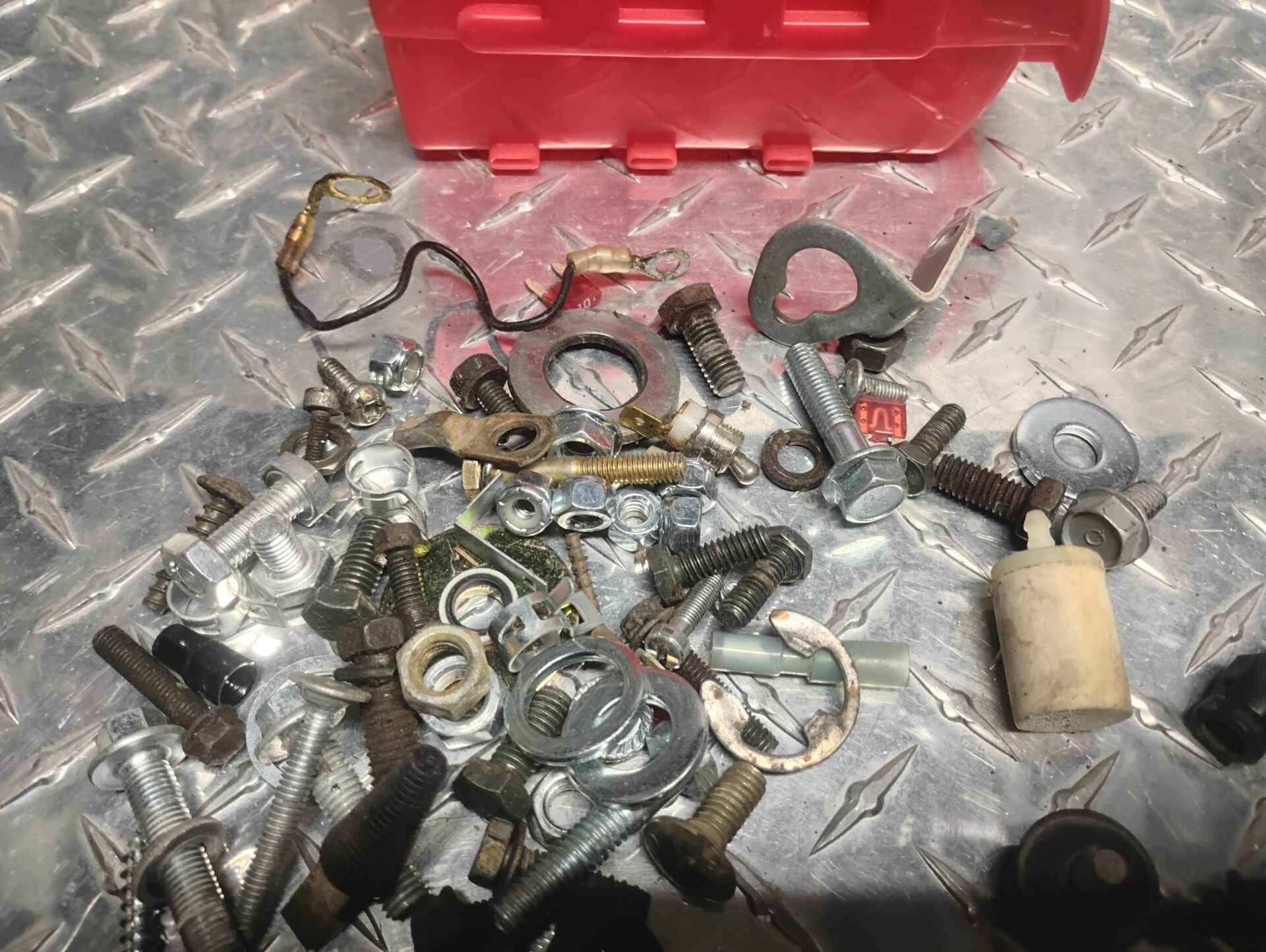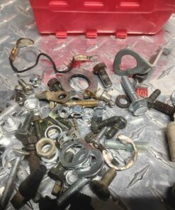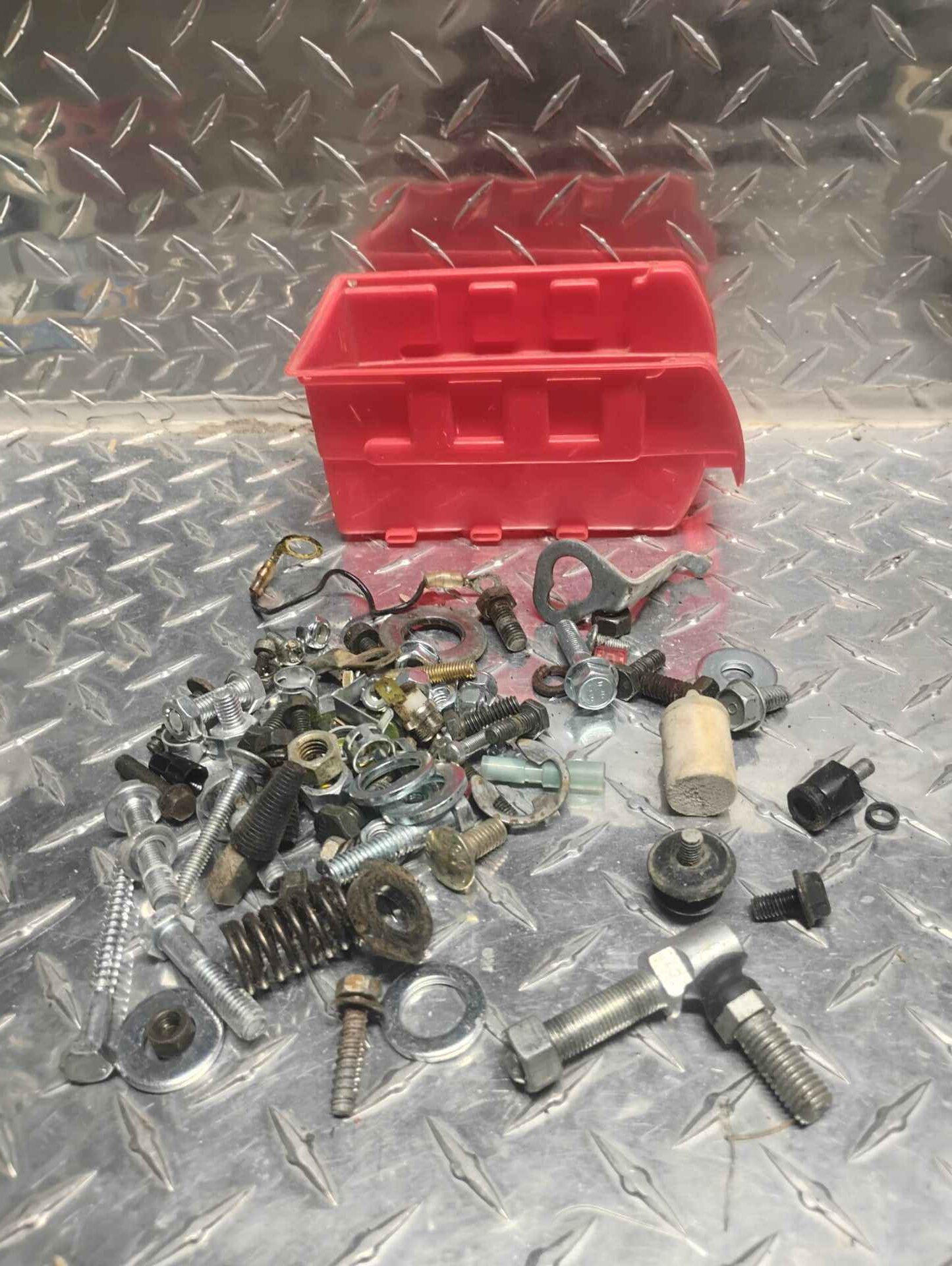 Assorted hardware with red parts bin