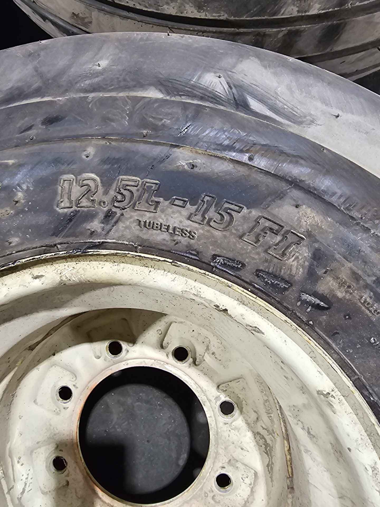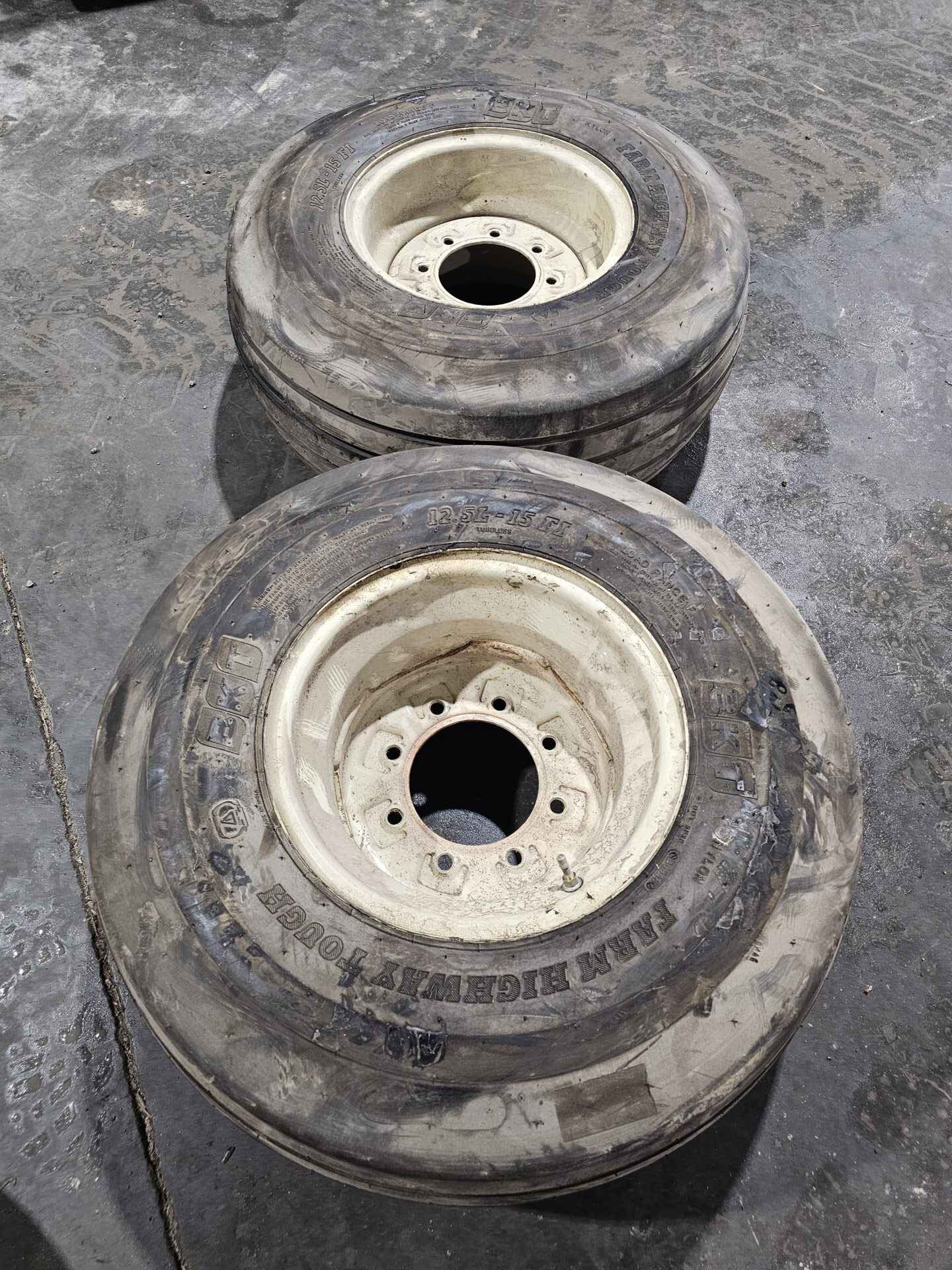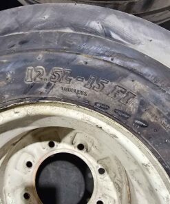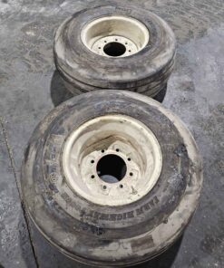 White 8 bolt implement rim. Tires are new mounted on used rims. Load range F 8 ply. Rim offset 6″ boltside x 4″ hubside.
