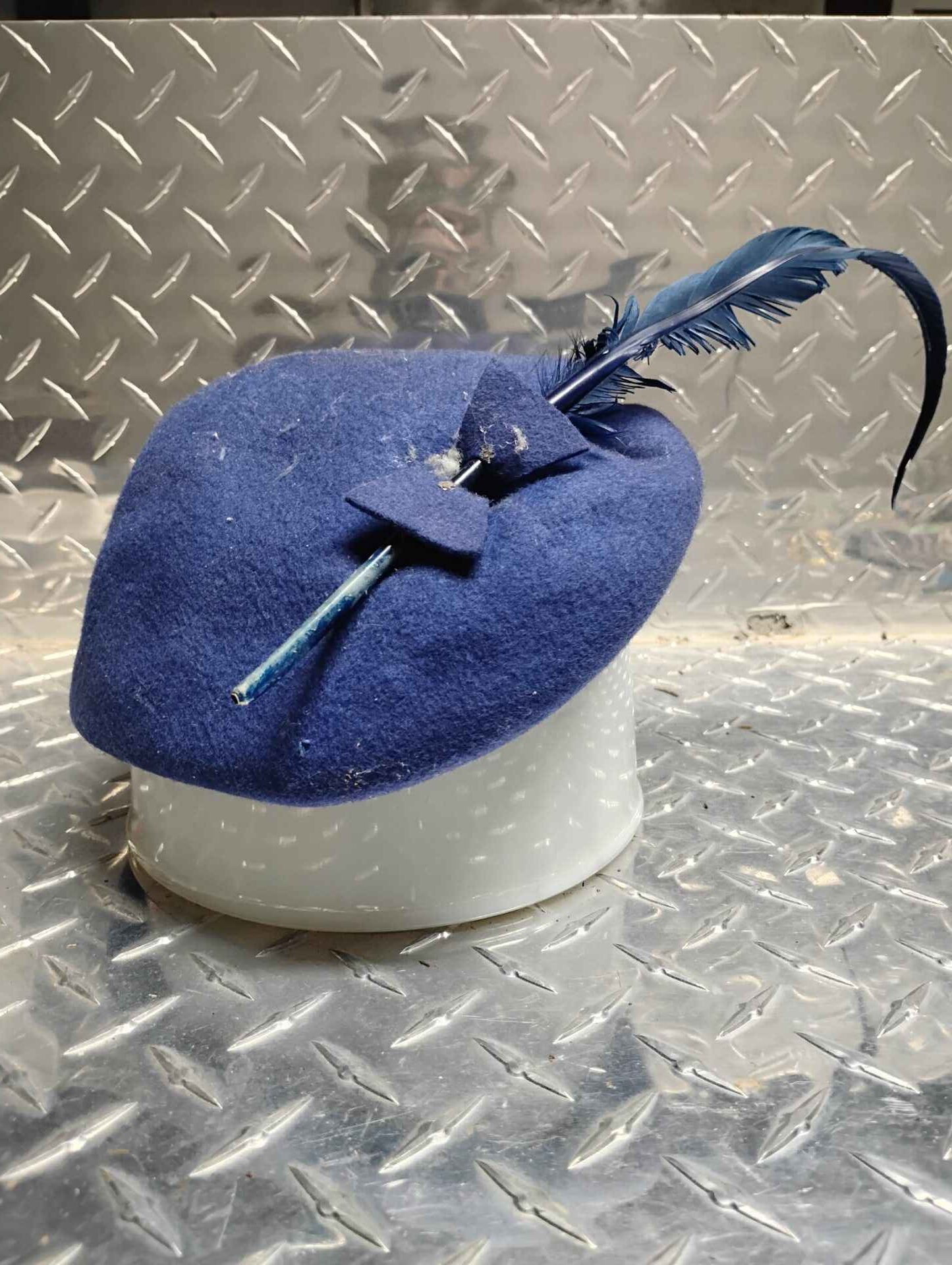blue beret with feather