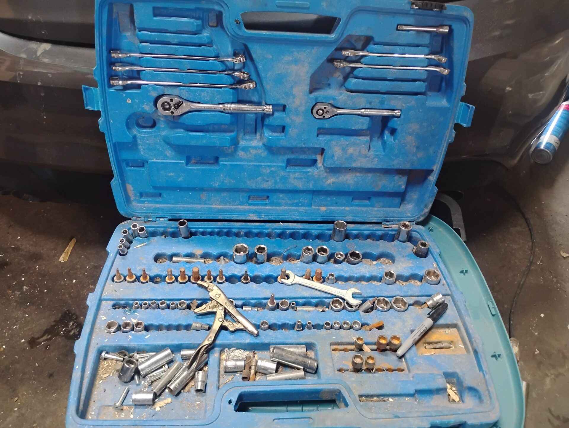 Blue tool box with miscellaneous tools