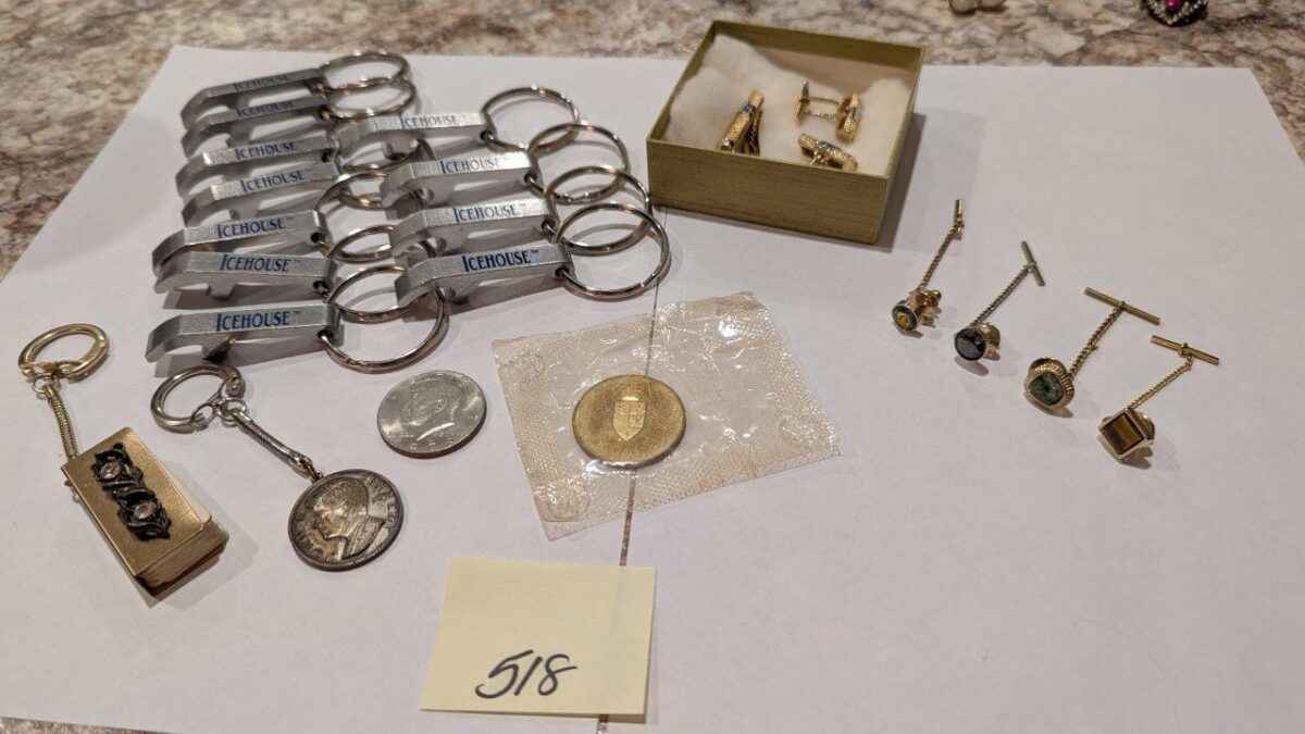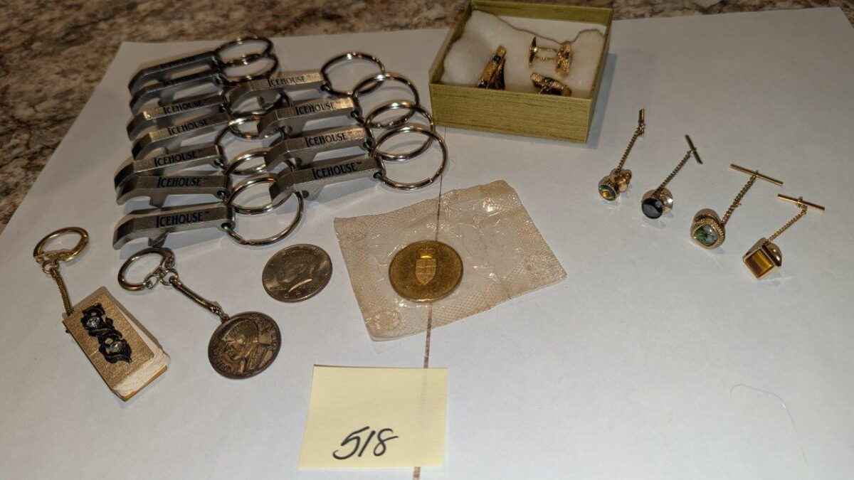 Bottle openers, key chains, cuff links and tie pins