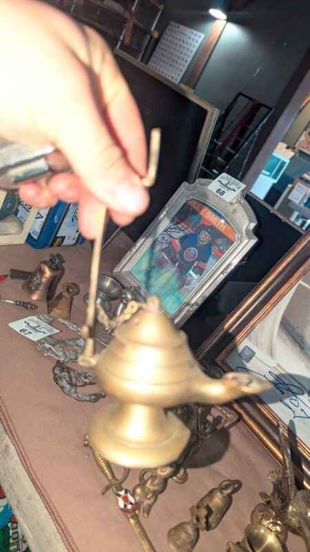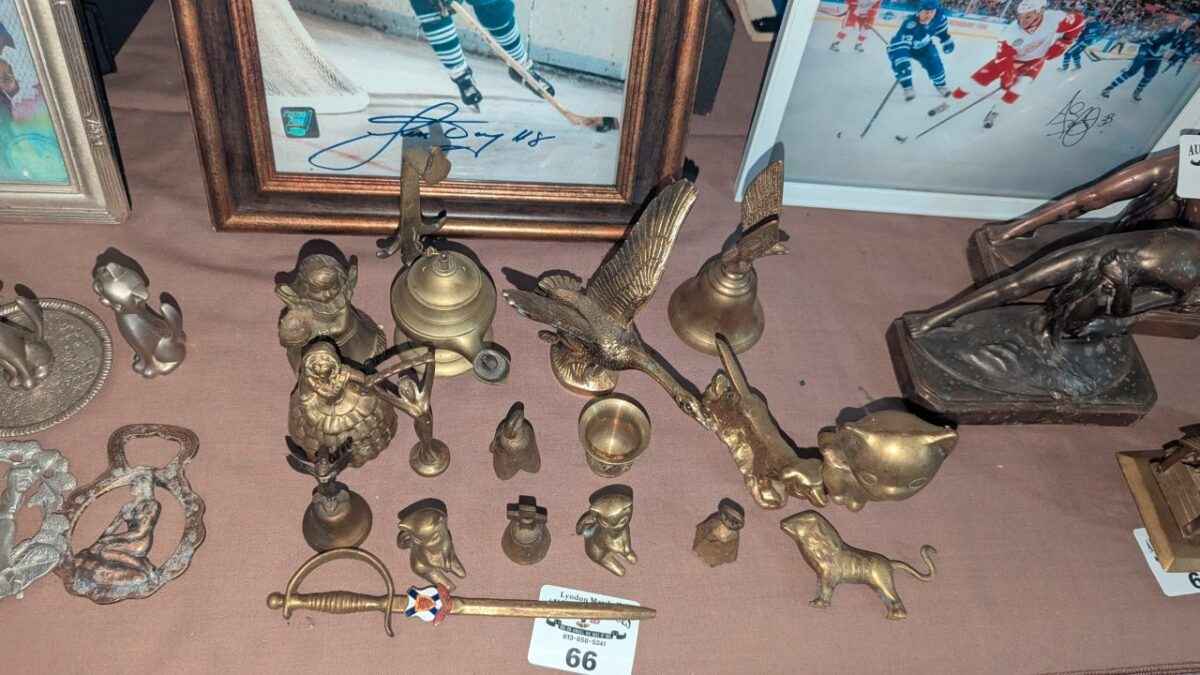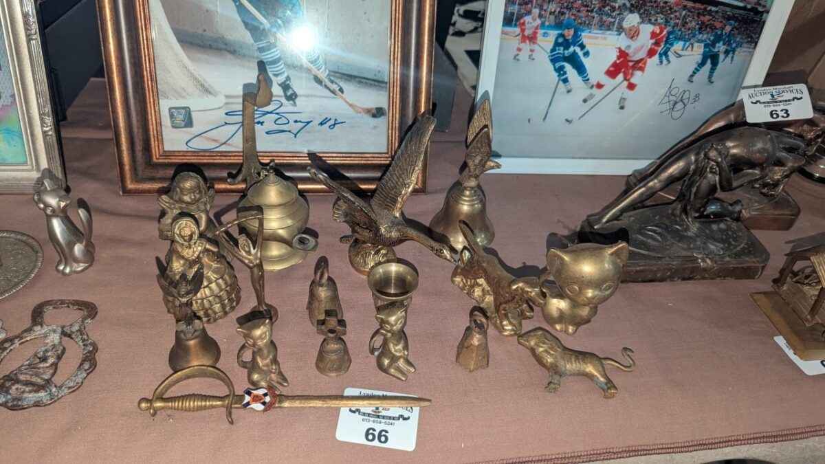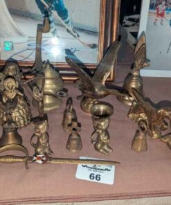 Brass bells, candle stick holders, statues, etc
