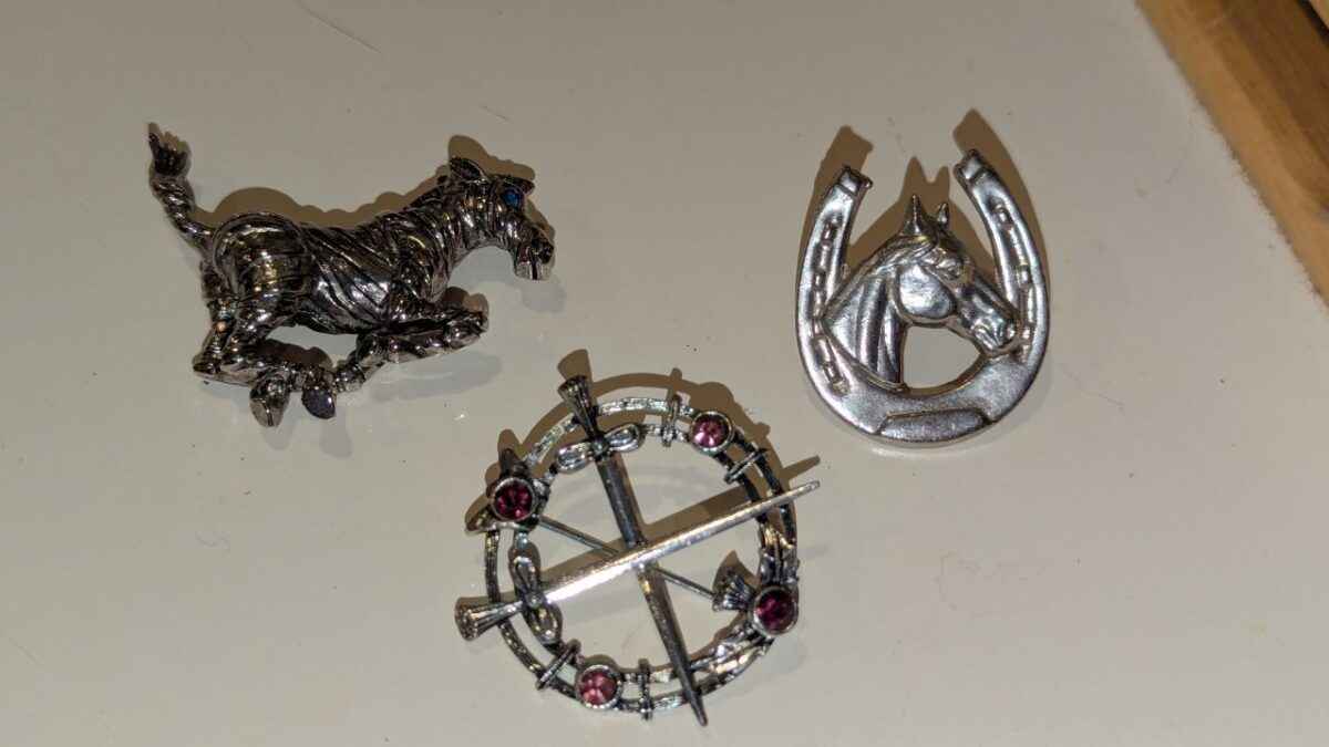 Celtic Brooch, Galloping horse pin and horse head tie ring