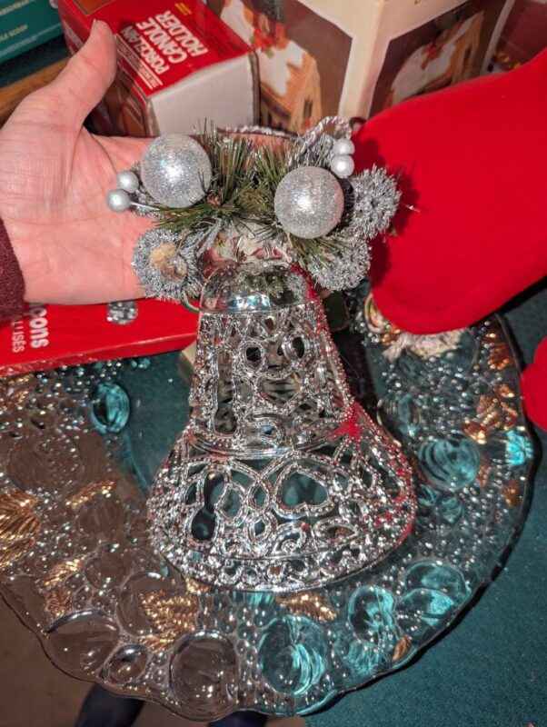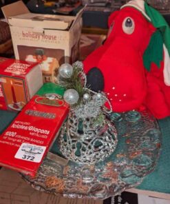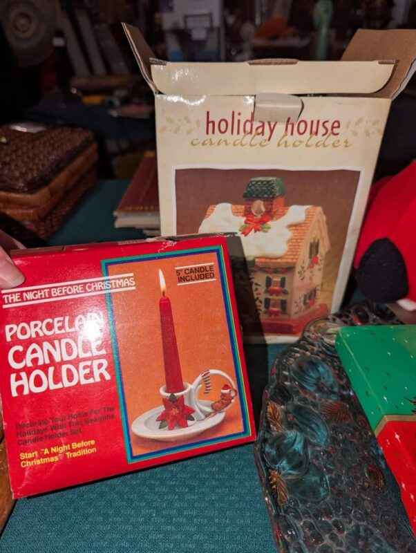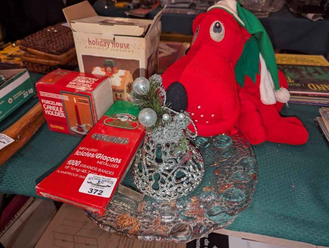 Christmas plush, tinsel, candle holders, accent bowl, etc